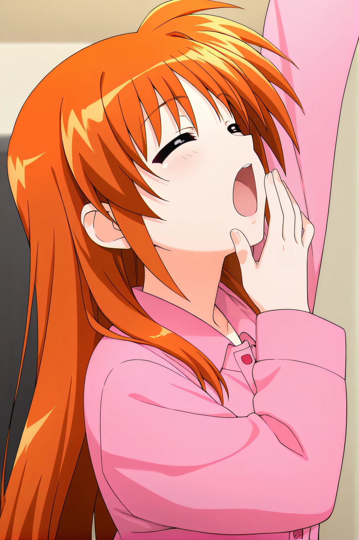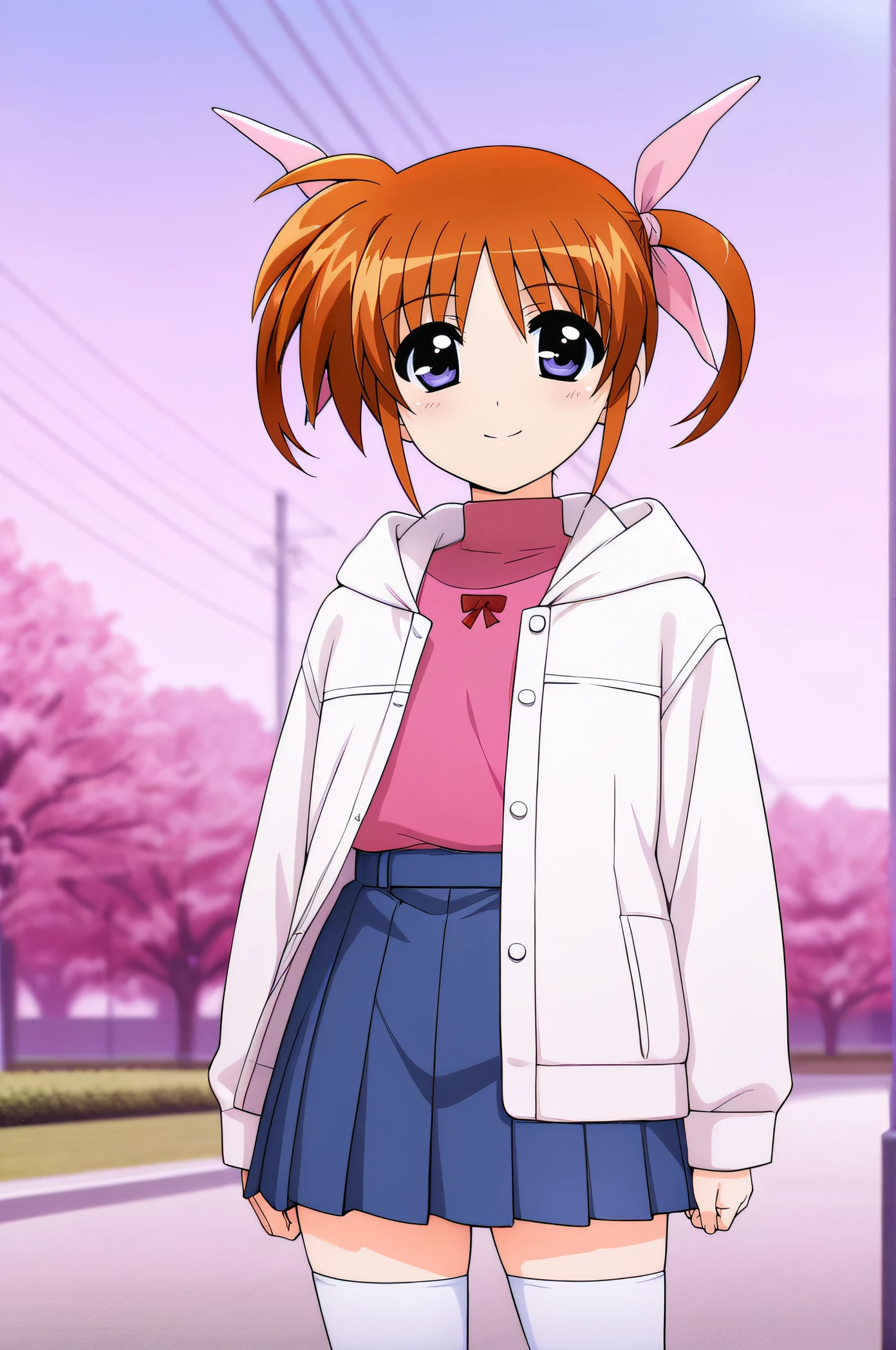 nanoha, orange hair, short twintails, pink ribbons, purple eyes, pink shirt, turtleneck, long sleeves, white jacket, open clothes, hood, blue pleated skirt, white thighhighs
