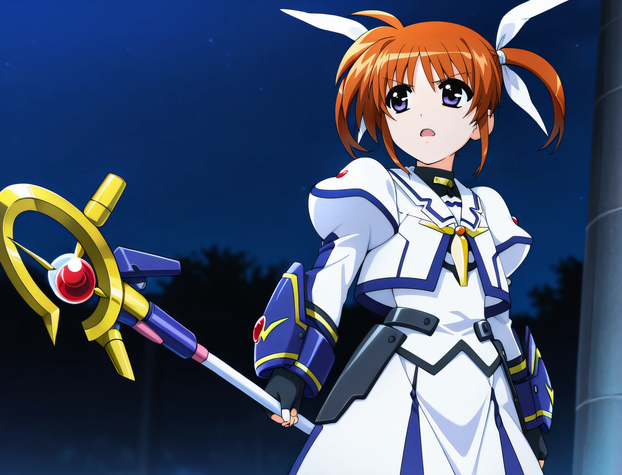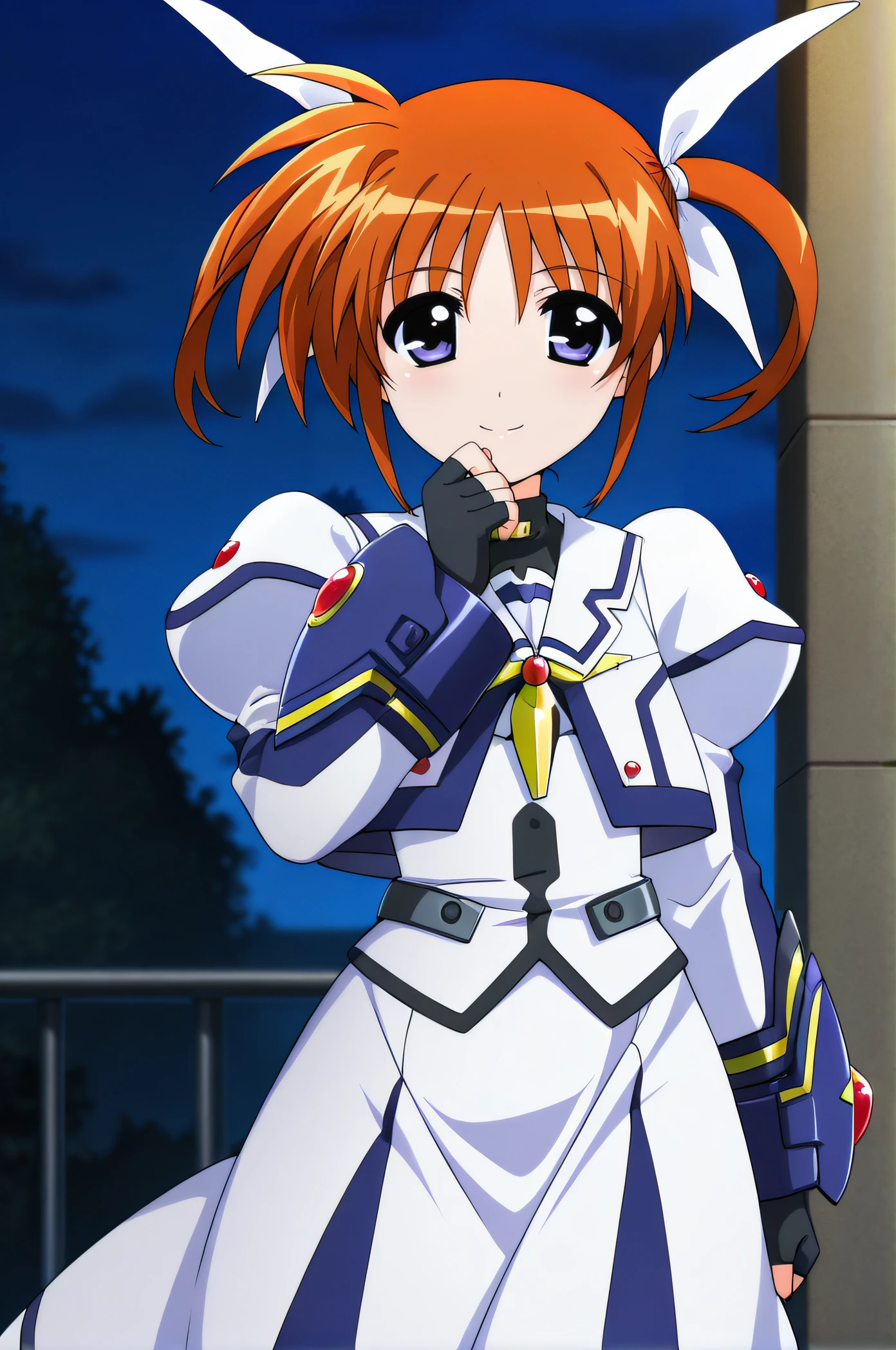 nanoha, orange hair, short twintails, white ribbons, purple eyes, barrier jacket, white dress, black fingerless gloves