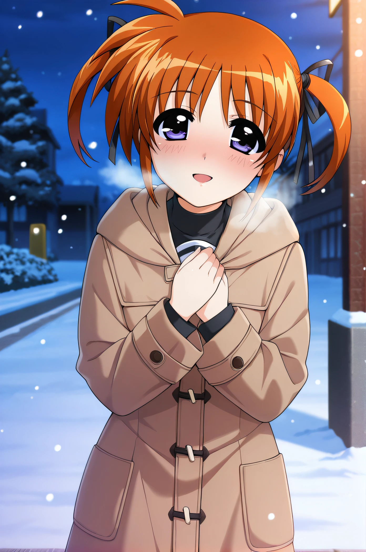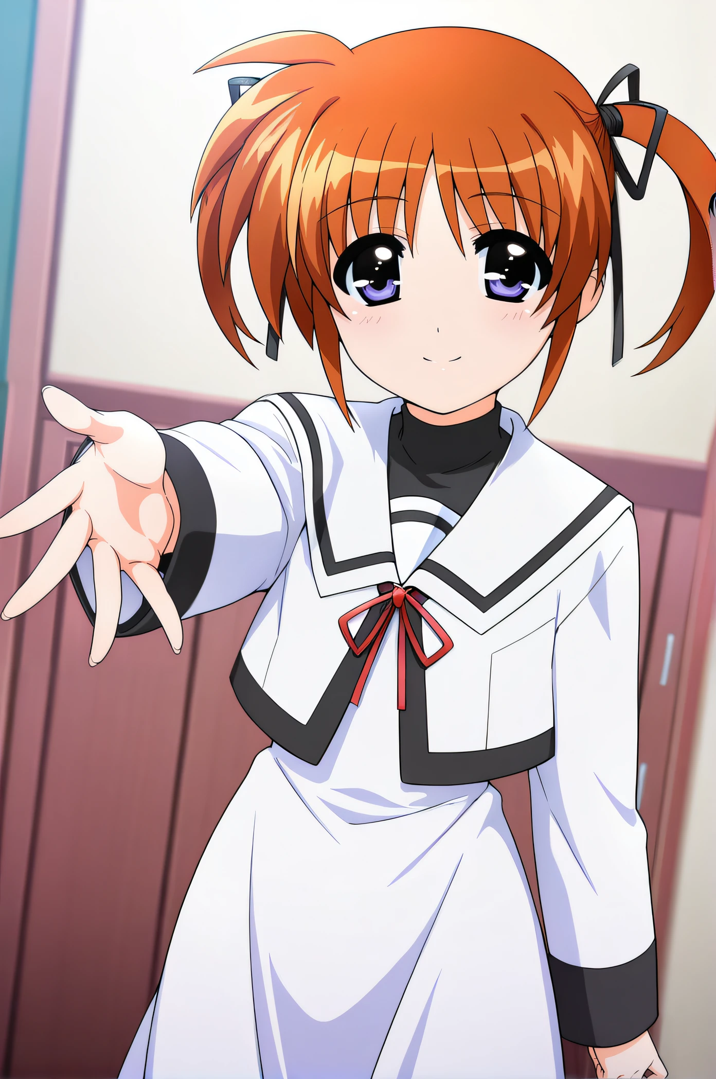 nanoha, orange hair, short twintails, black ribbons, purple eyes, school uniform, white dress, long sleeves, white sailor collar, red_ribbon, black turtleneck, long dress
