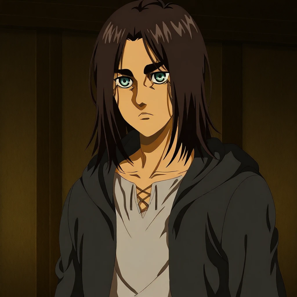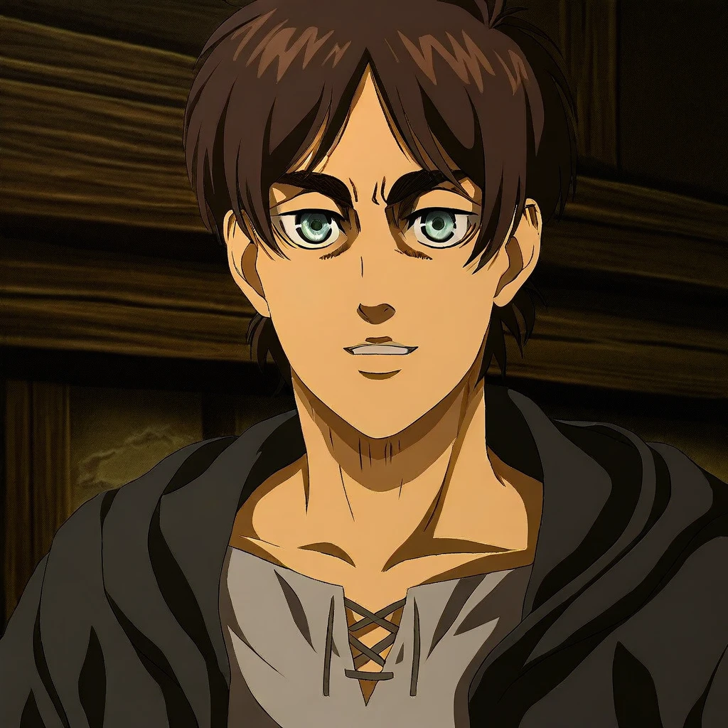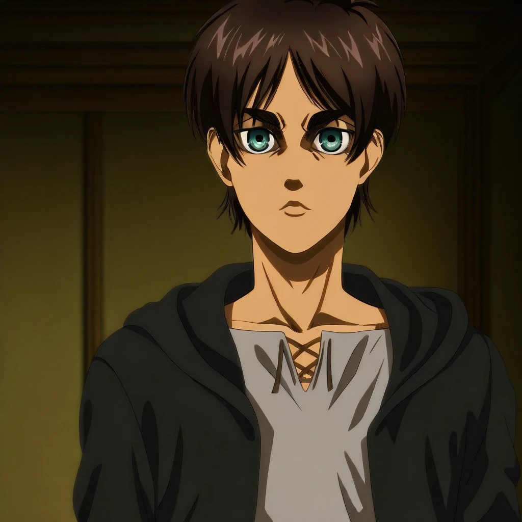 eren_yeager, teal eyes, brown hair, short hair, hair bun, single hair bun