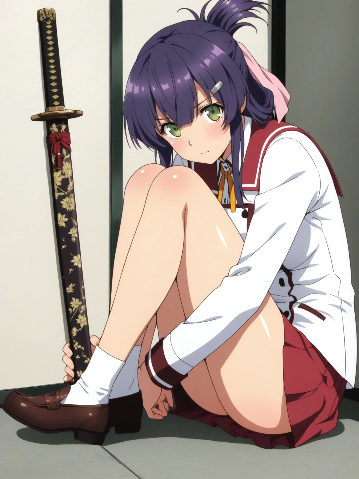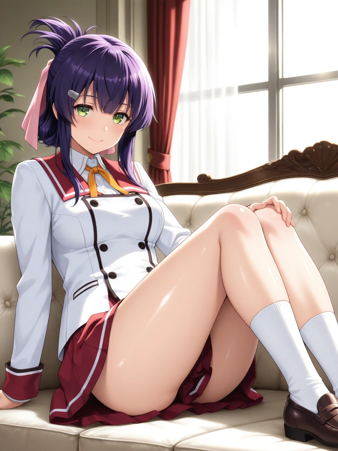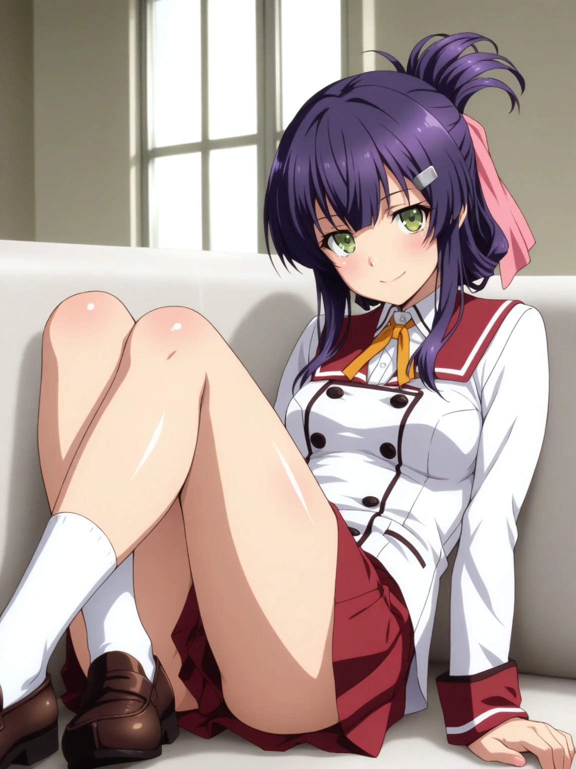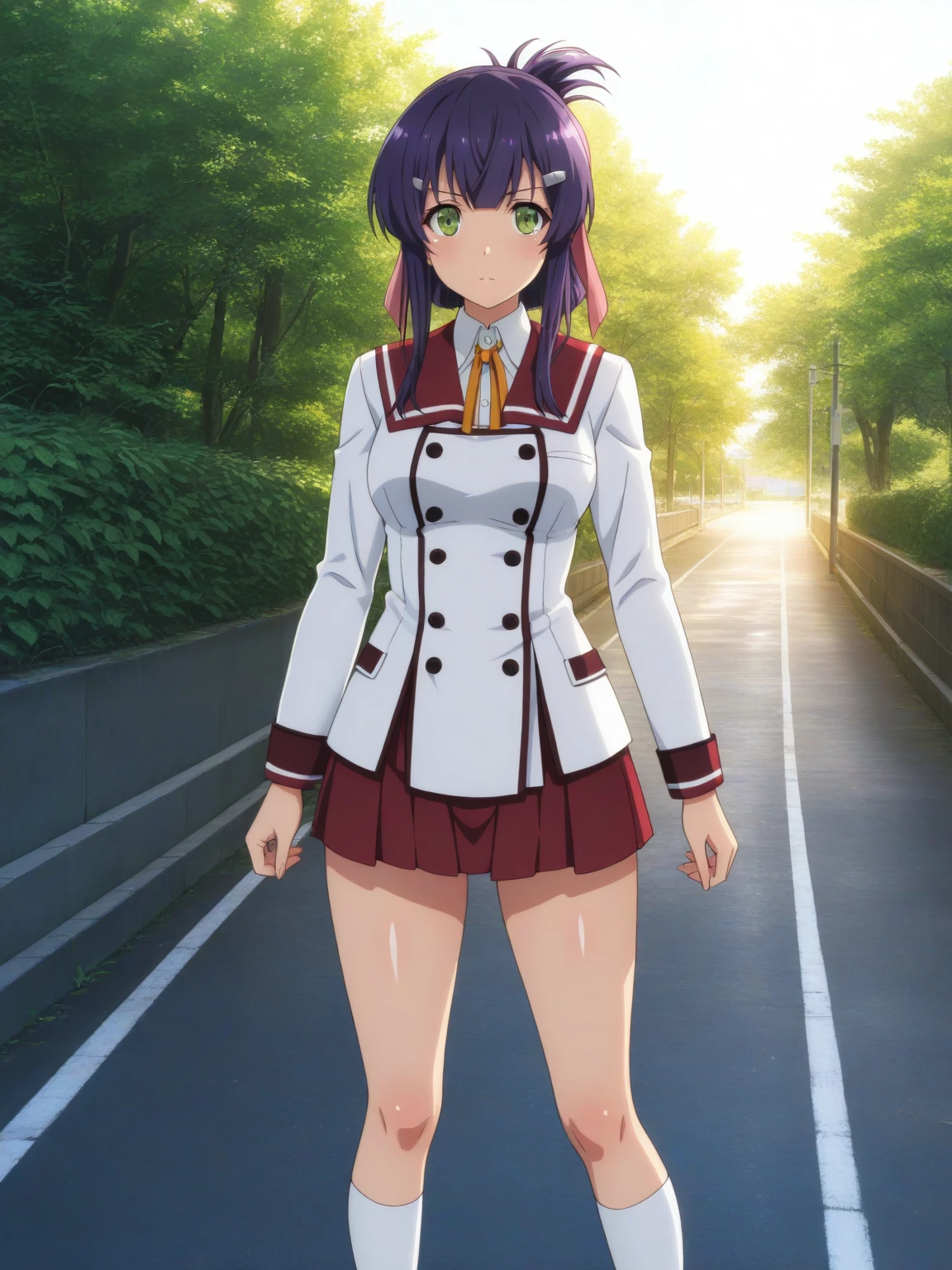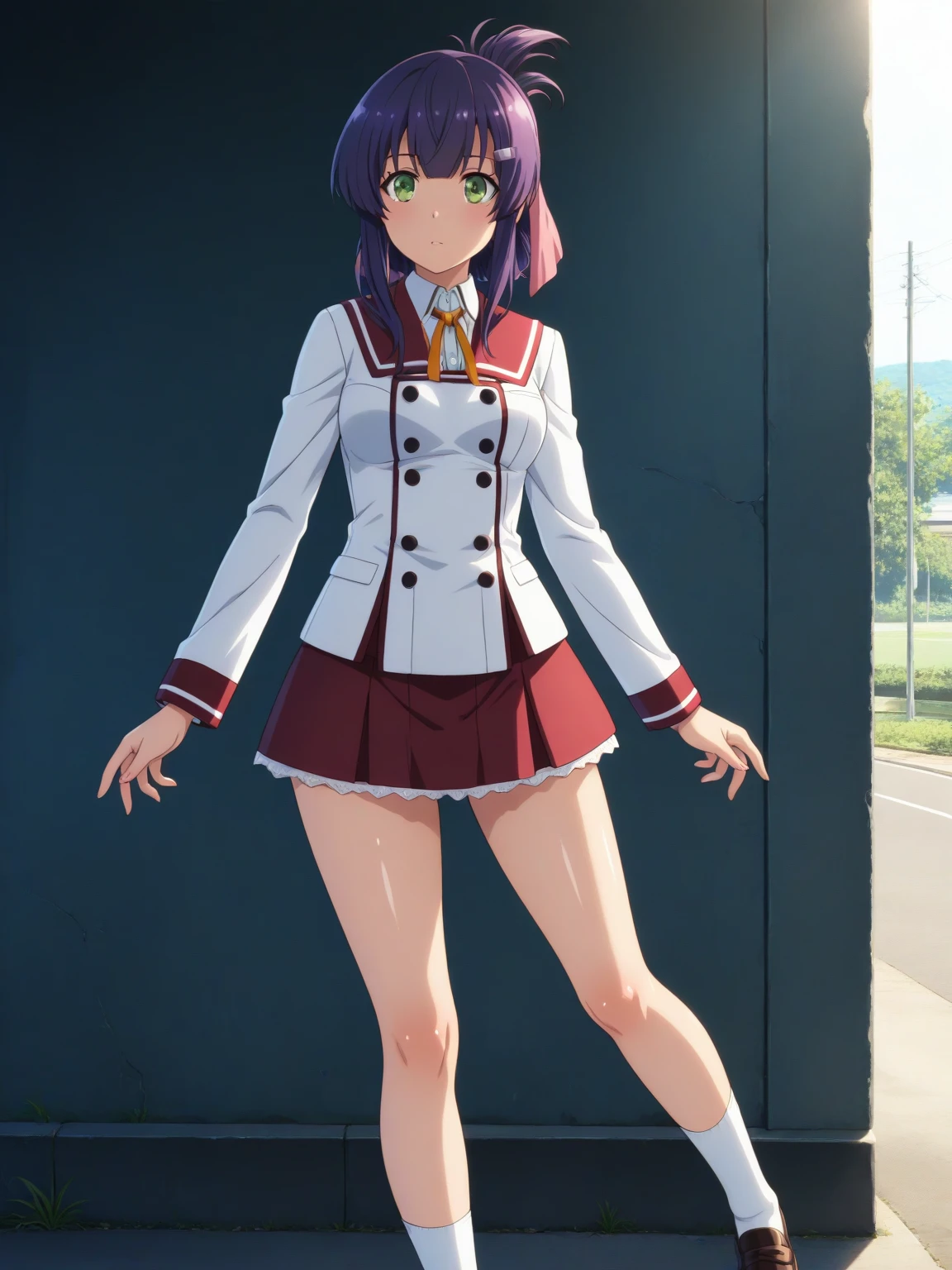 Clothes: (school uniform, white blazer, long blazer, neck ribbon, sailor collar, red skirt, bare thighs, white socks, loafers)