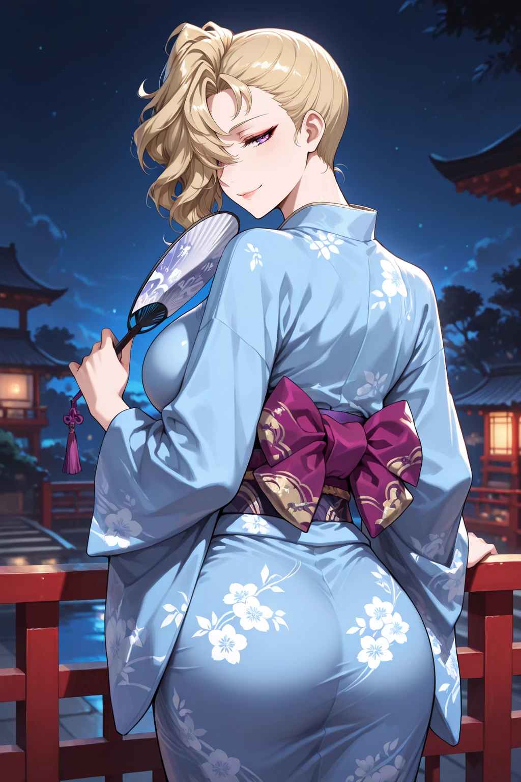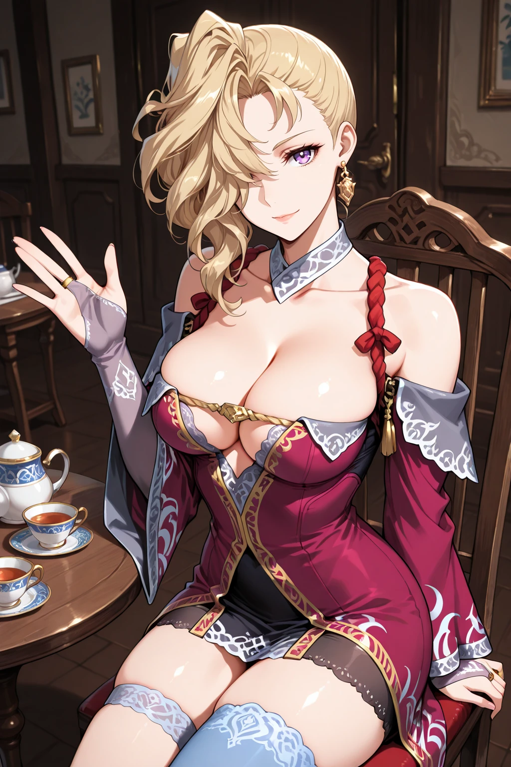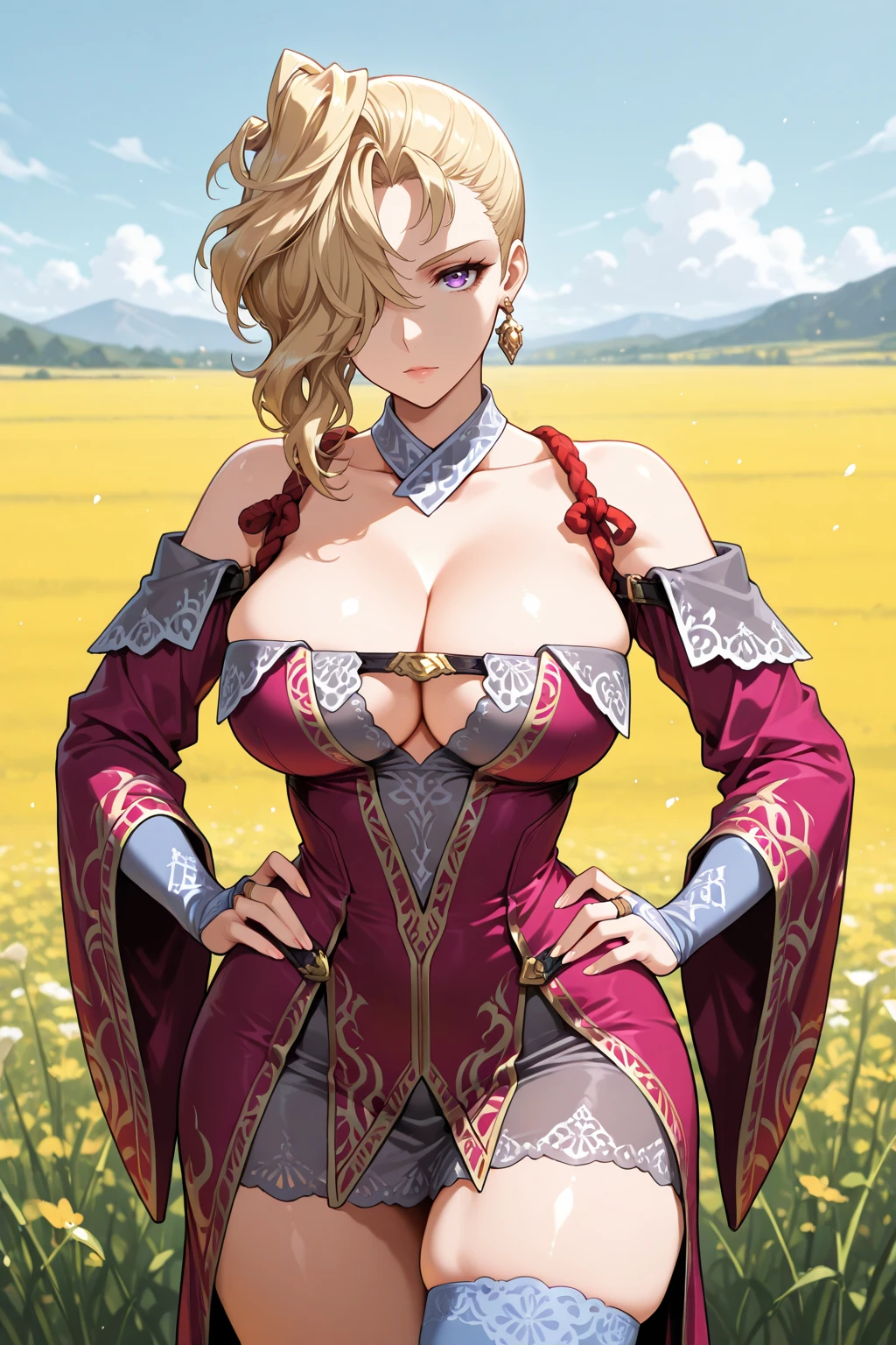 skdnslds, blonde hair, short hair, wavy hair, hair over one eye, one eye covered, purple eyes
