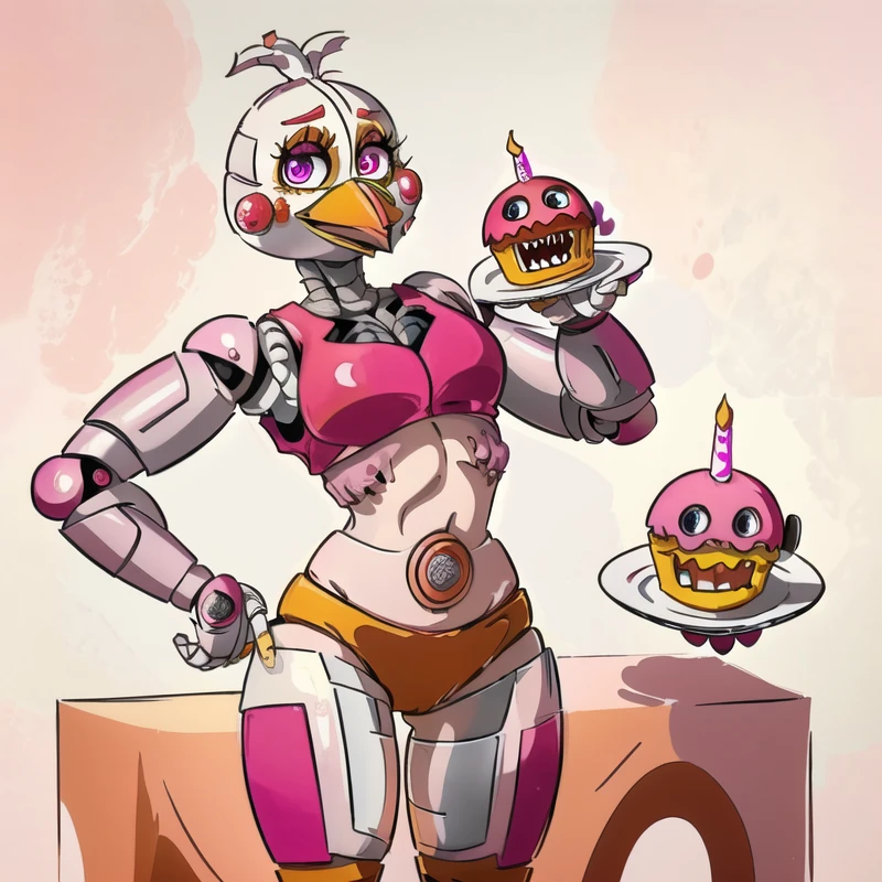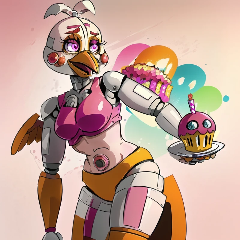 2. "funtime chica, beak, 1girl, pink eyes, midriff, robot, orange panties, robotic joints, solo, solo focus, pink crop top, sleeveless,"