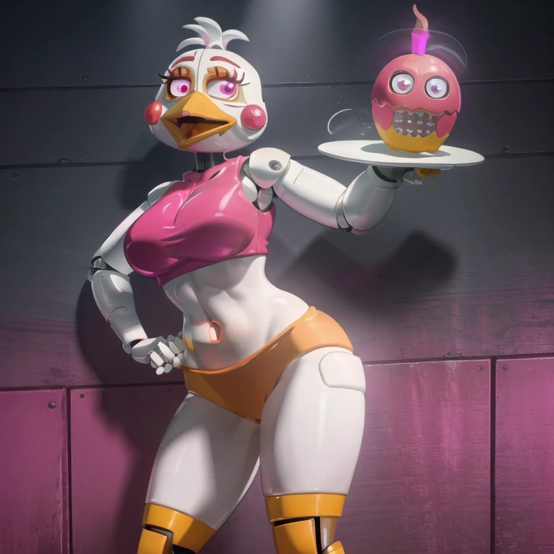 funtime chica, beak, 1girl, pink eyes, midriff, robot, orange panties, robotic joints, solo, solo focus, pink crop top, sleeveless,