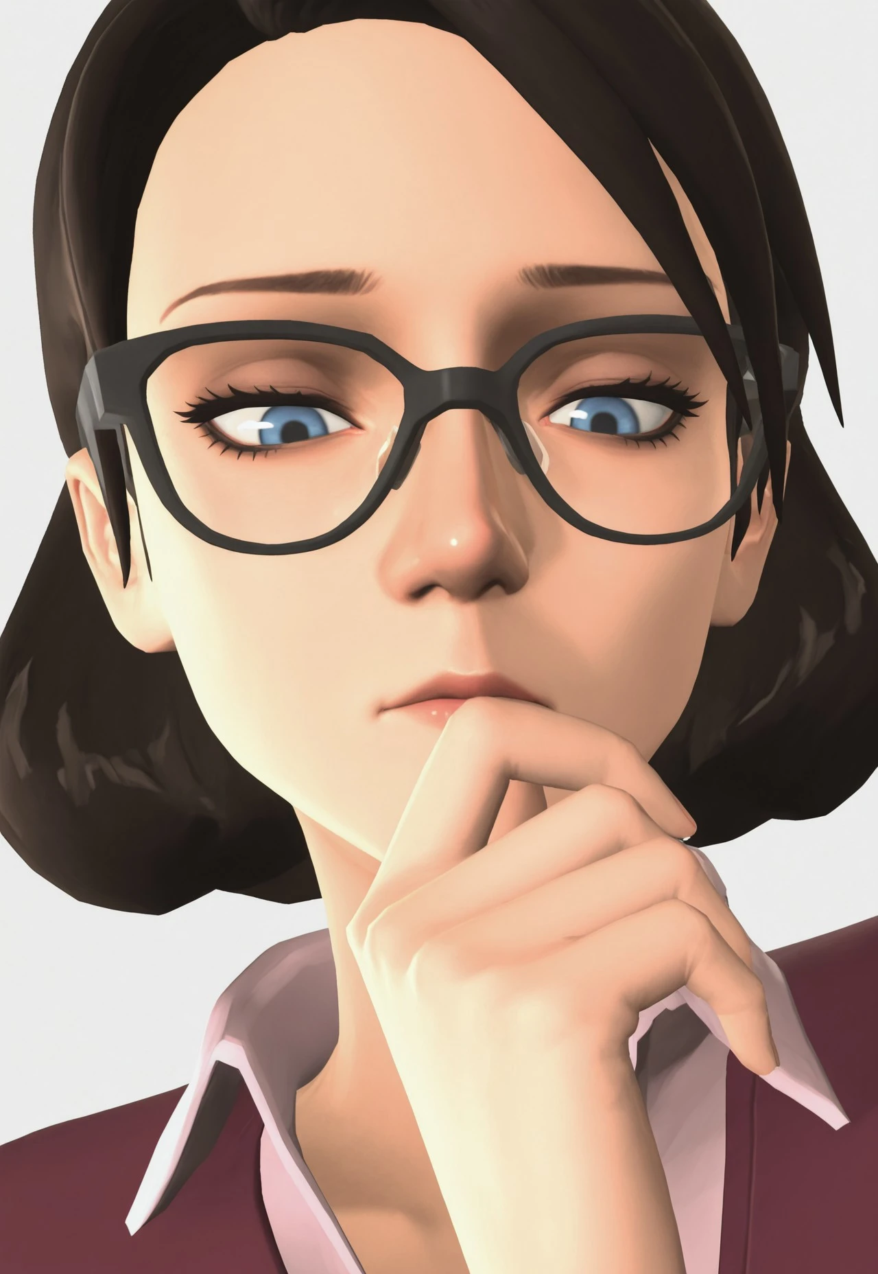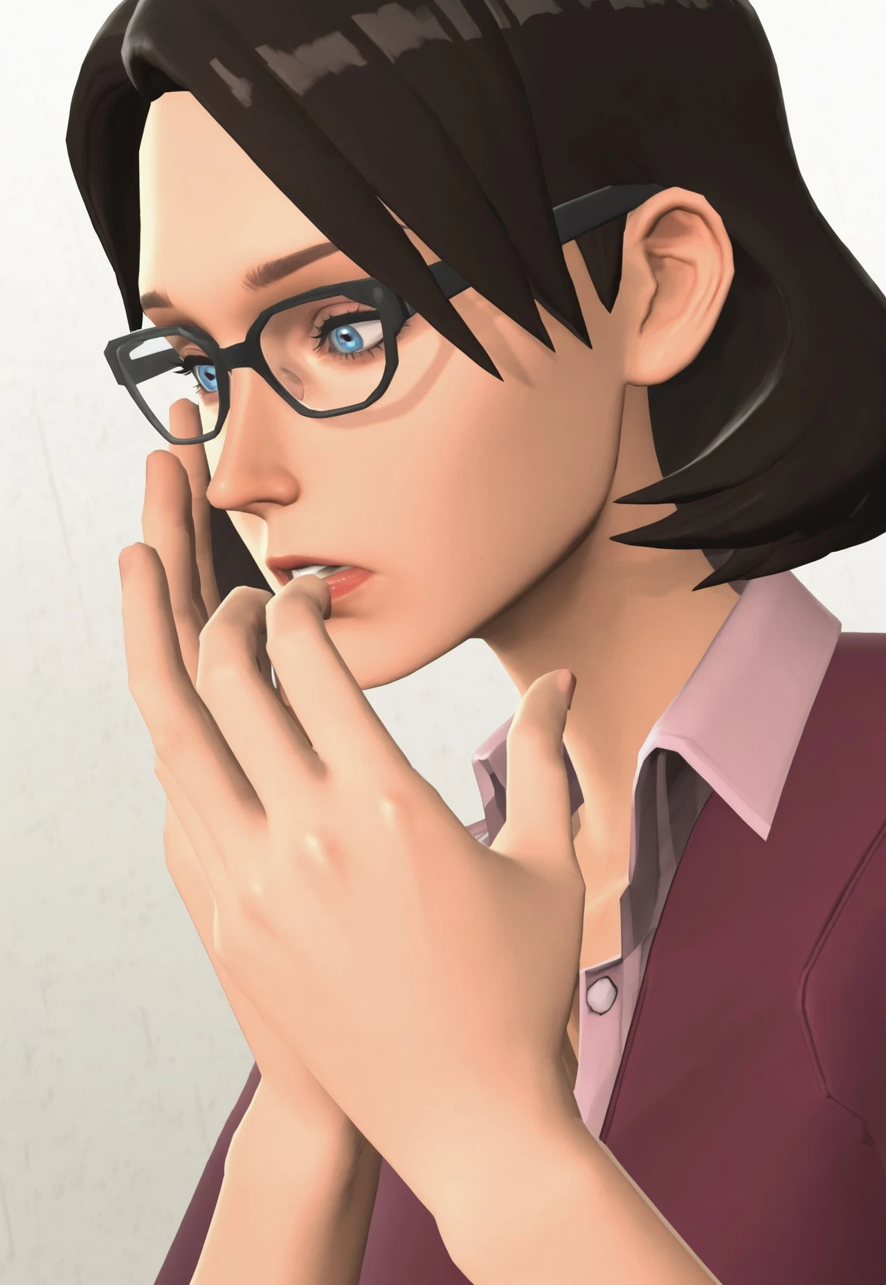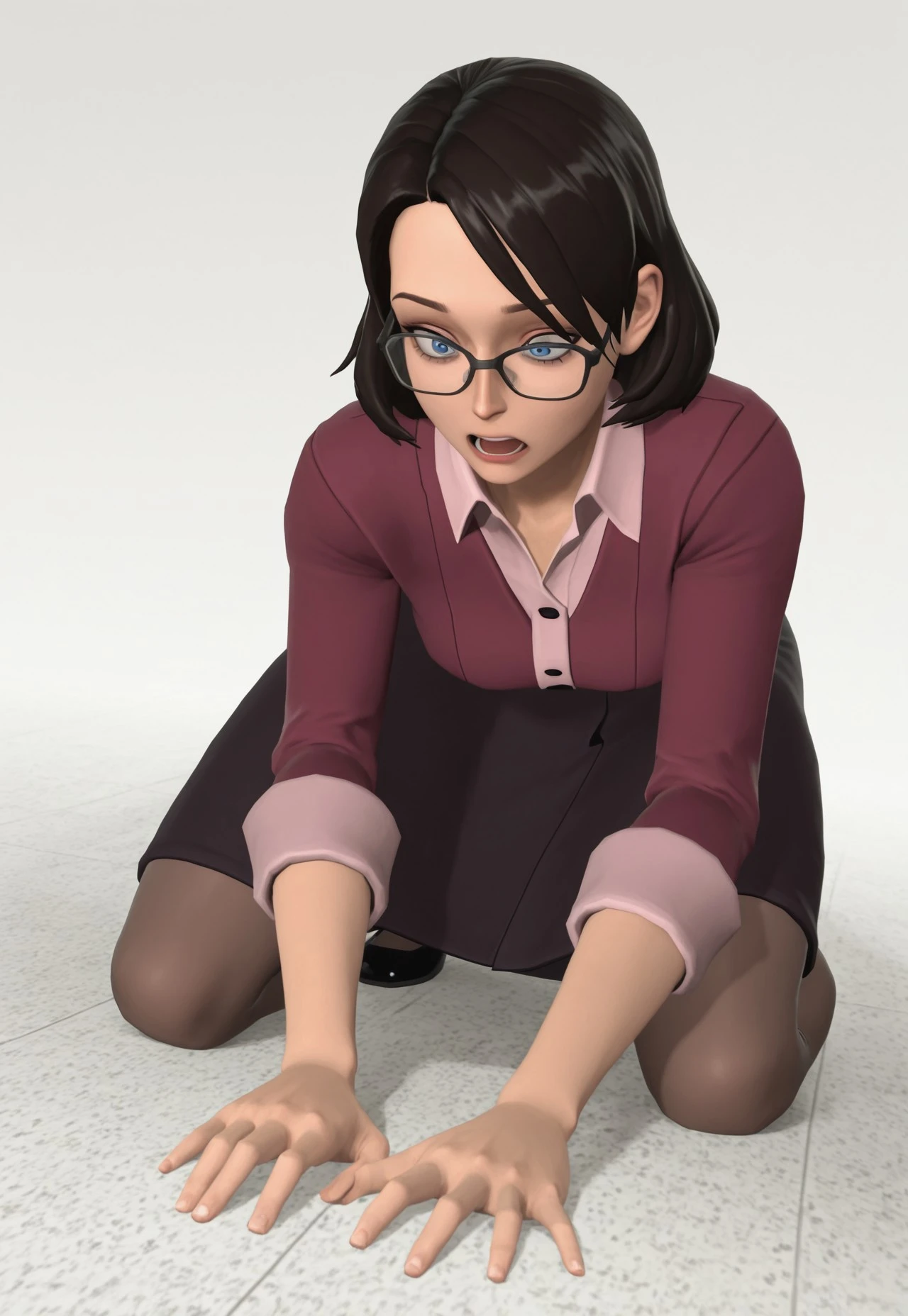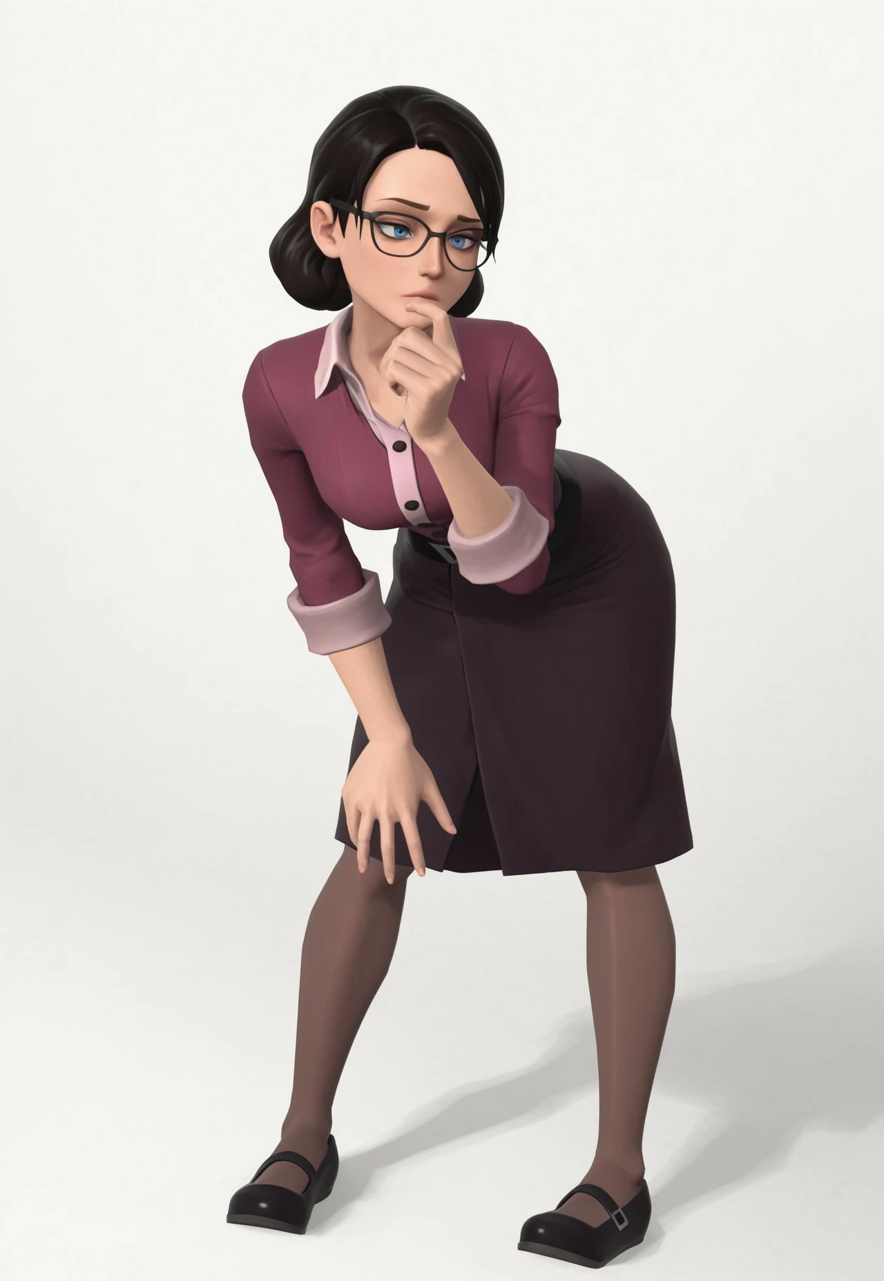 miss pauling (team_fortress_2), 3d, team_fortress_2, 1 girl, short hair, hairbun, glasses, blue eyes, long sleeves, shirt, pencil skirt, pantyhose, mary janes
