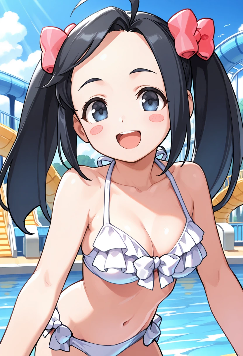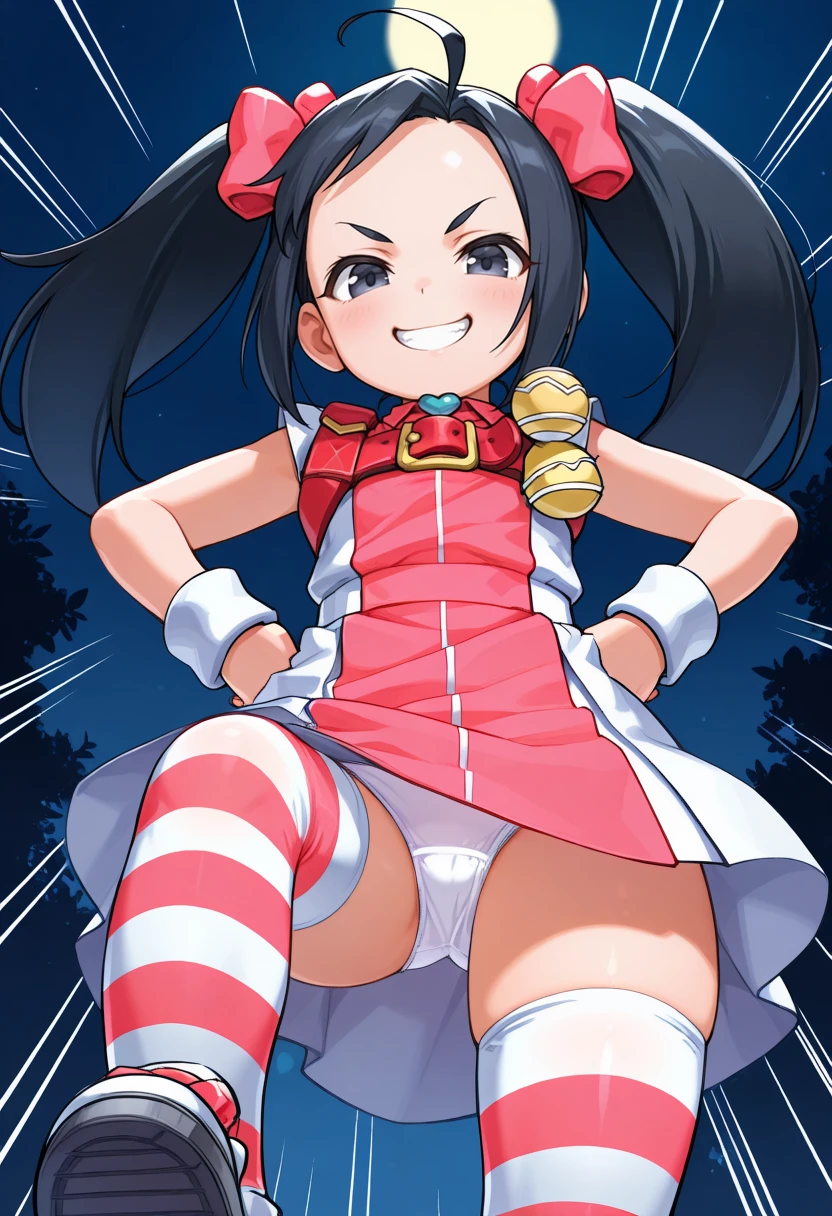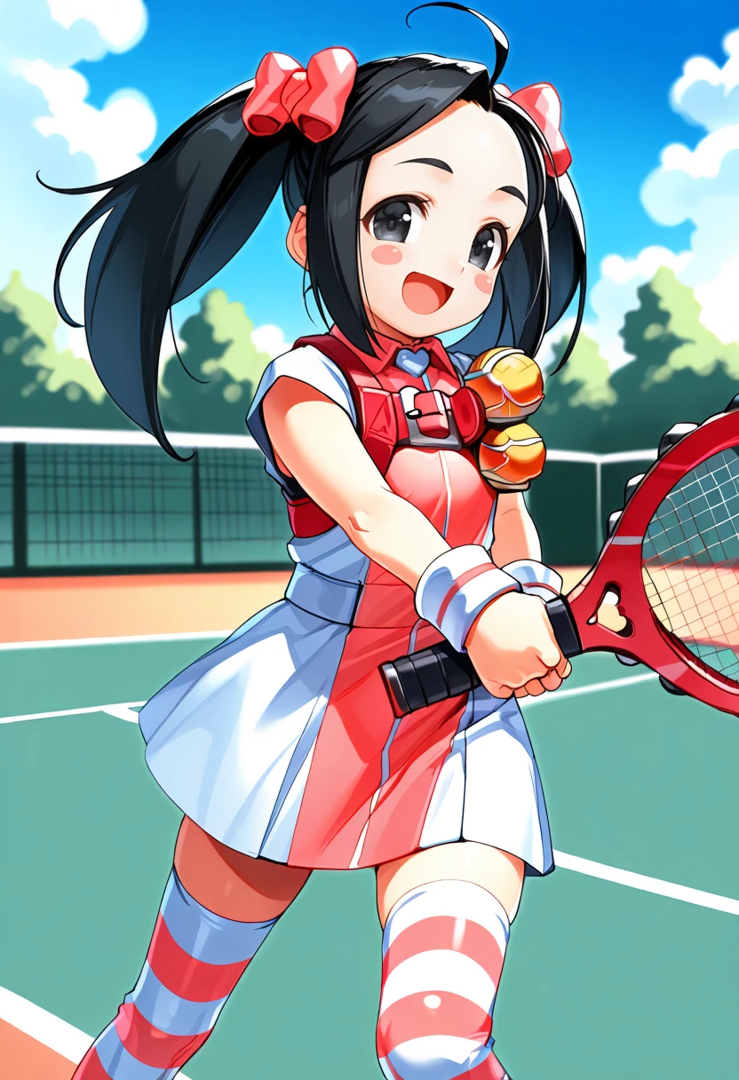 short dress, wrist cuffs, striped thighhighs, black hair, twintails, ahoge, hair bow, black eyes, blush stickers, forehead