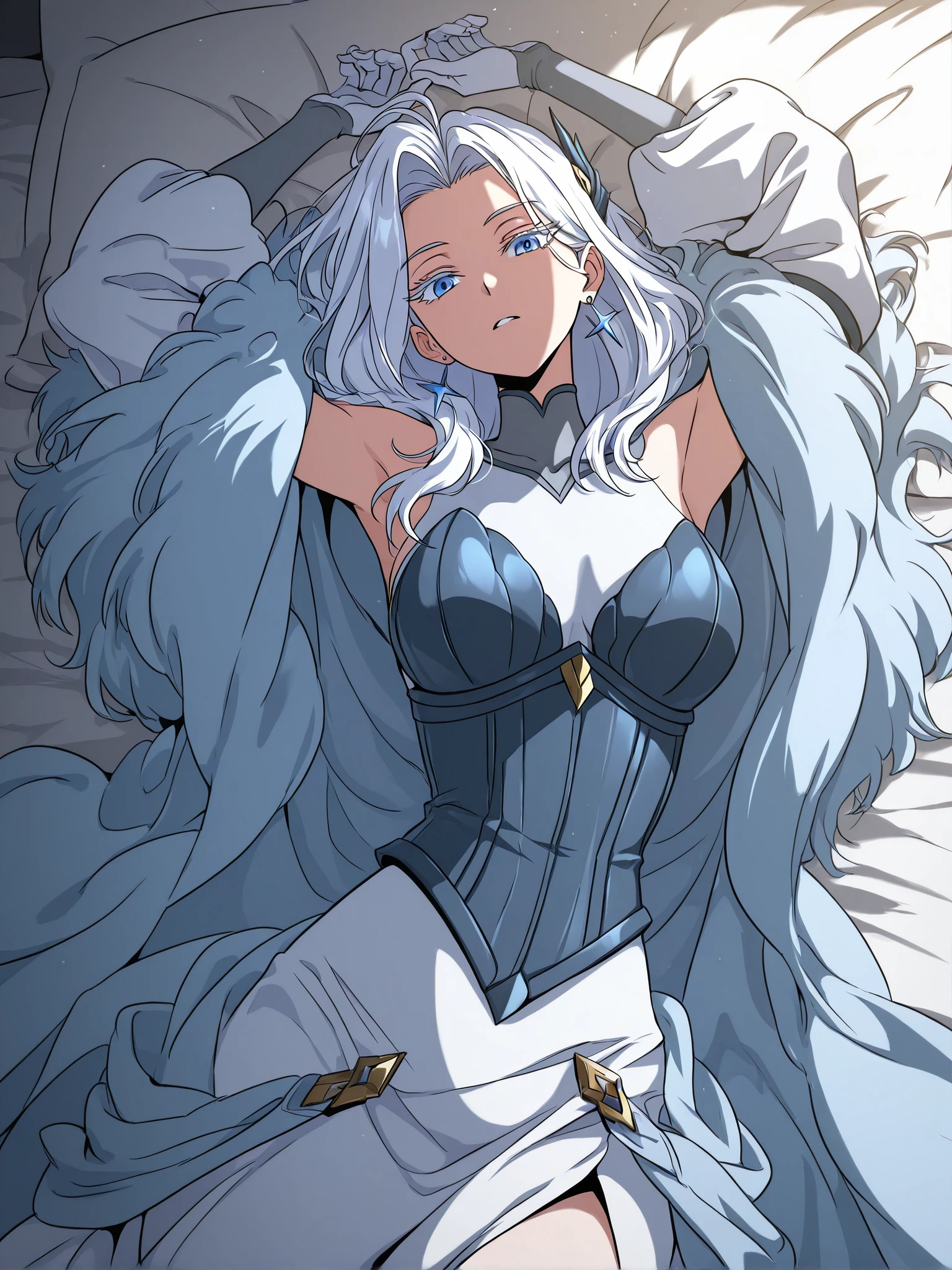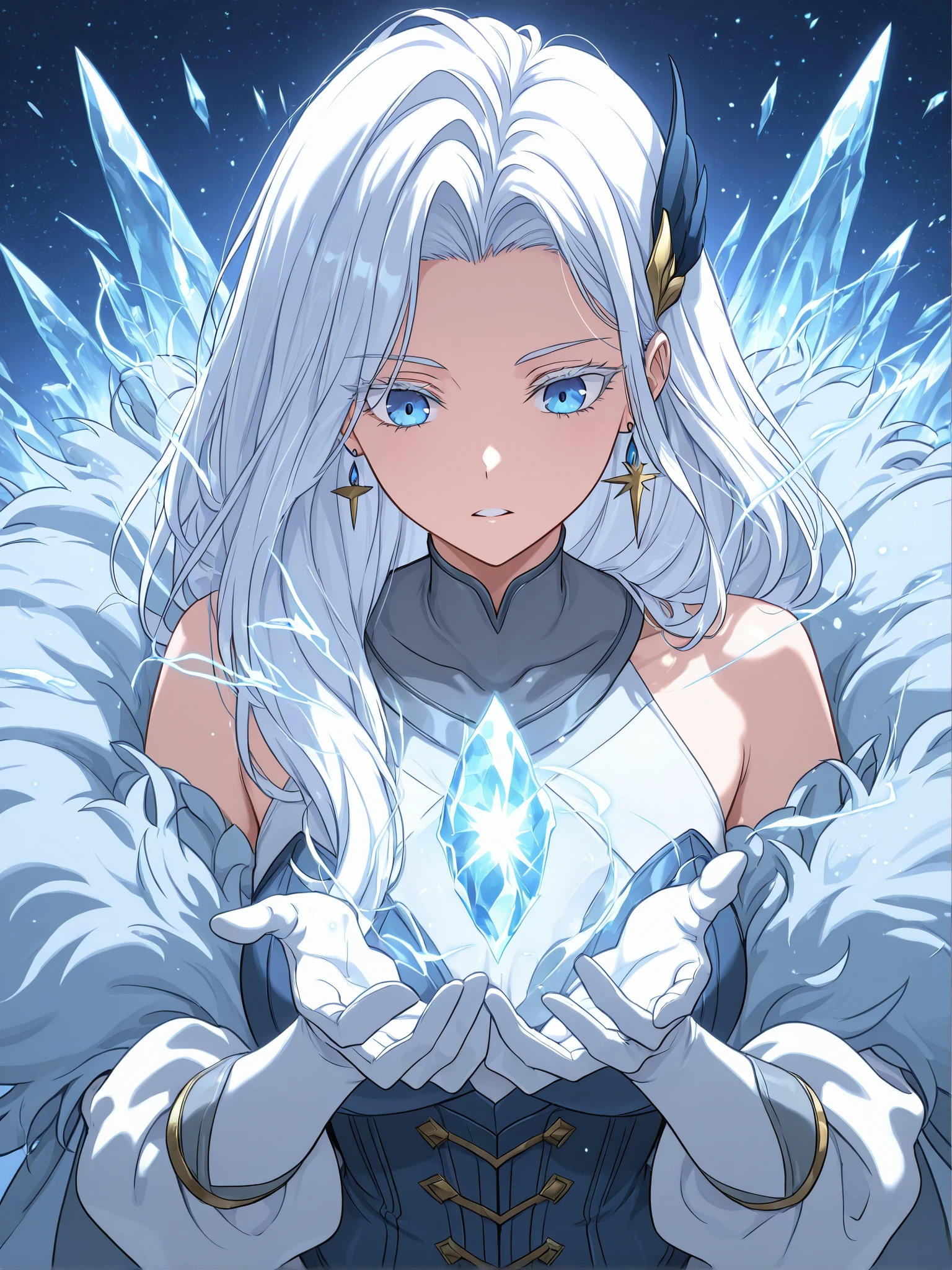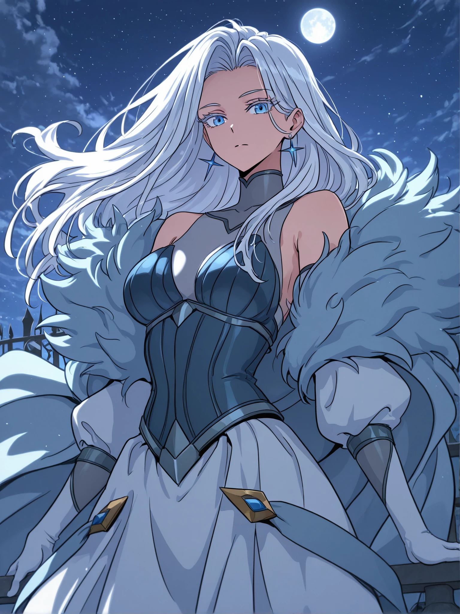 hair ornament,star earring,blue earring,light blue fur cloak,armor corset,blue corset,gown outfit,long outfit,white gown,detached sleeves,puffed sleeves,white gloves,