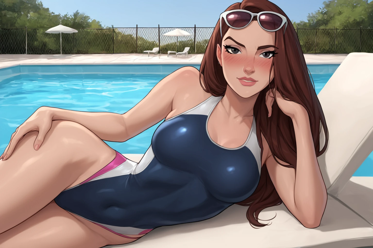 Marvel Swimsuit Special: sunglasses on head, swimsuit, one-piece swimsuit, thong, tan lines