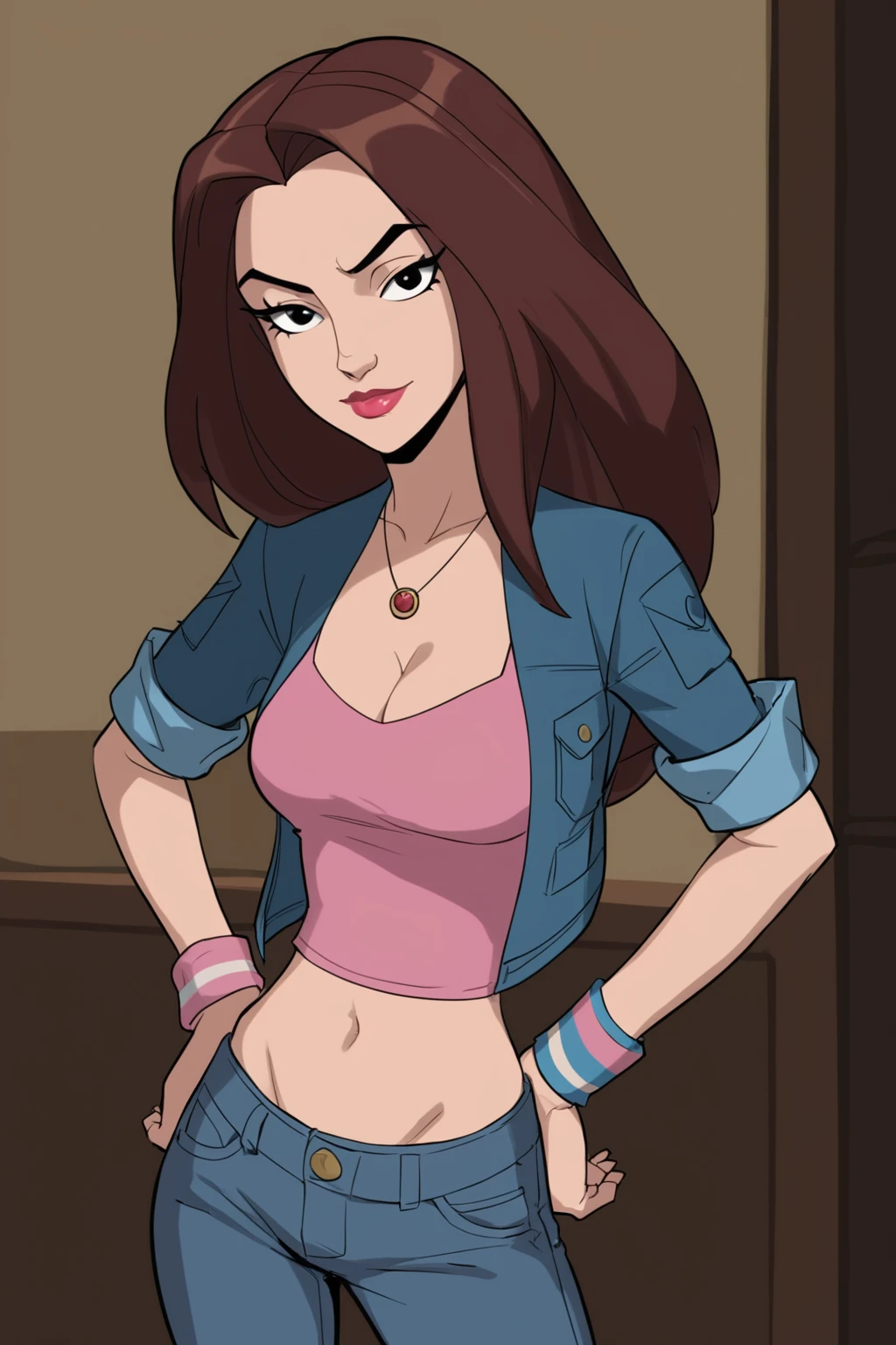 Casual Outfit: denim jacket, necklace, cleavage, pink shirt, midriff, wristband, pants