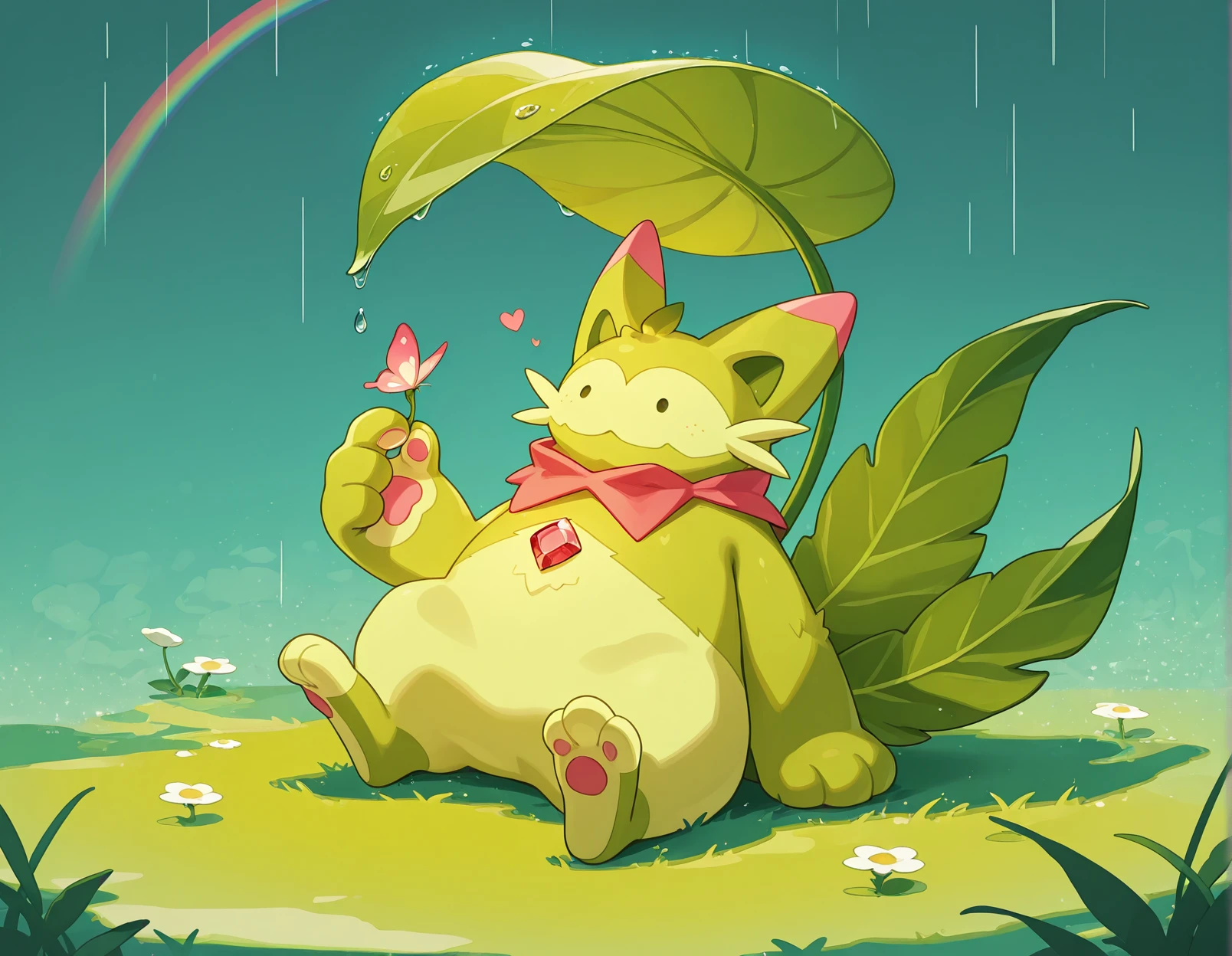 magiccat,pokemon \(creature\),dot eyes,cat ears,pink ear tips,light green face,whiskers,two-tone skin,green skin,light green skin,red bandana,chest gem,leaf tail,multiple tails,giant,fat,plump