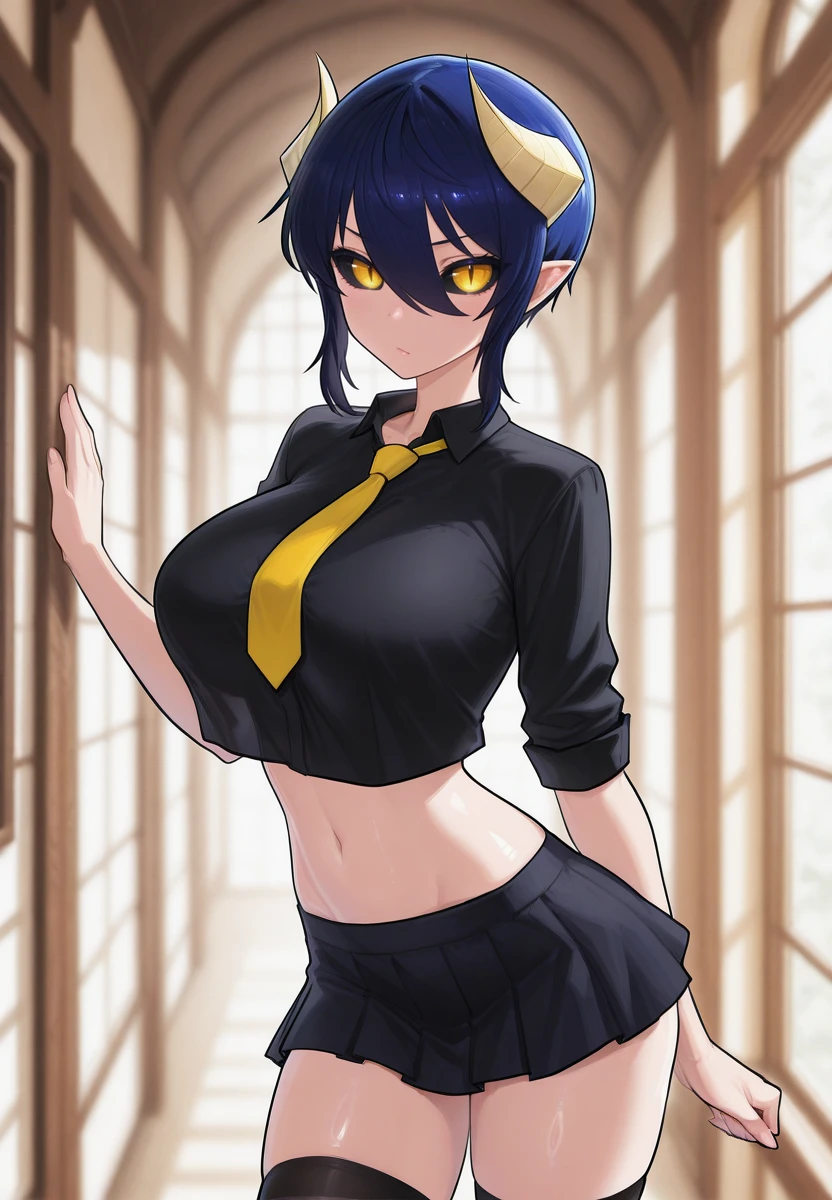 /jeaneamona/, 1girl, colored sclera, black sclera, yellow eyes, blue hair, short hair, pointy ears, slit pupils, horns