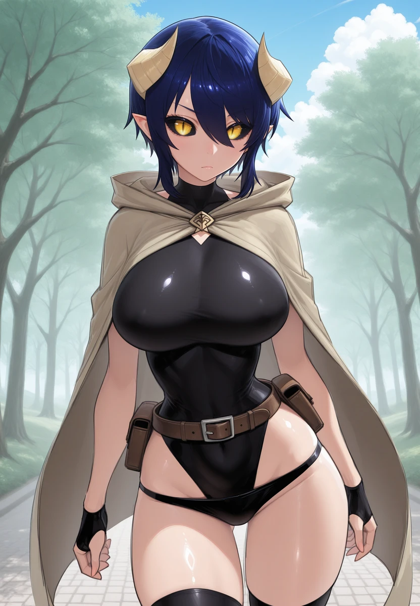 hair between eyeleotard, boots, black thighhighs, belt, cloak, fingerless gloves, panties,