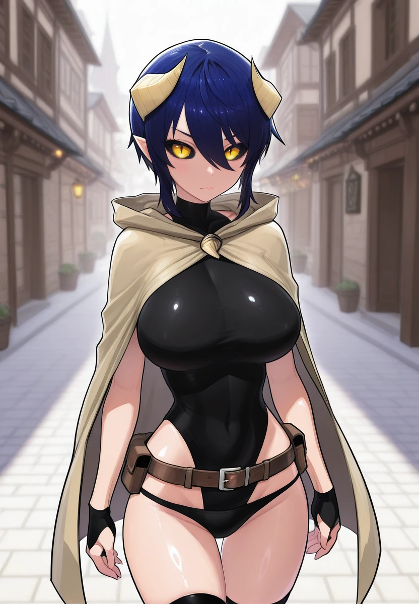 leotard, boots, black thighhighs, belt, cloak, fingerless gloves, panties,