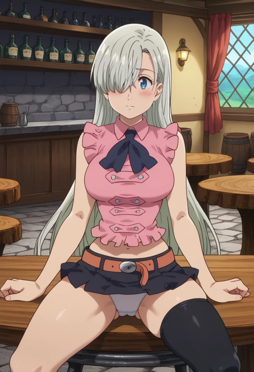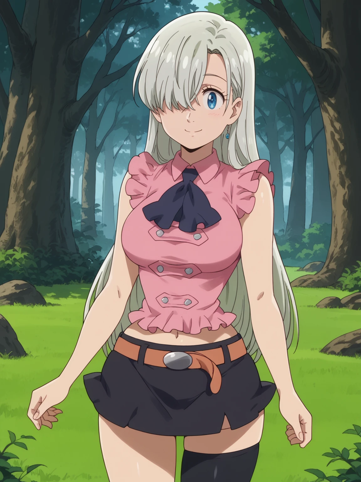pink shirt, sleeveless, navel, black pleated skirt, short skirt, single thighhigh, black thighhighs, brown belt