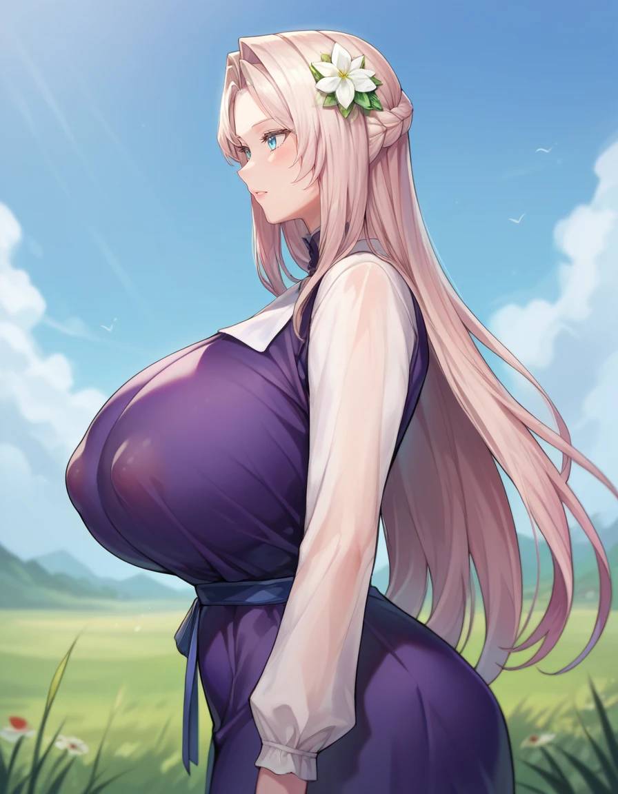 "mnemdress,white hair,purple dress, forehead,long hair,blue eyes,close up,hair flower,see-through sleeves, long sleeves,ribbon"