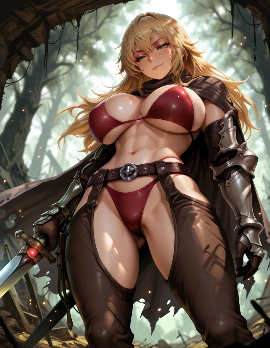 brown gloves, cape, belt, armor, single gauntlet, red bikini, chaps,