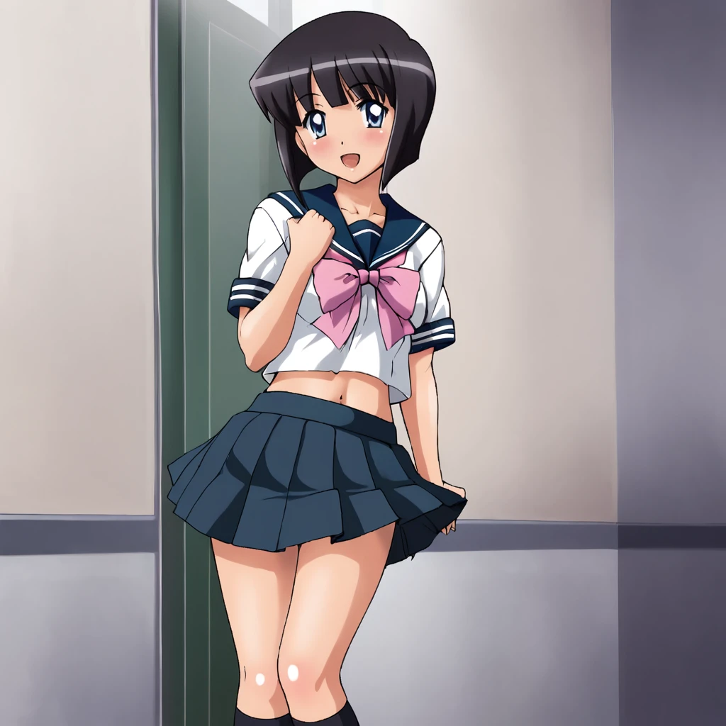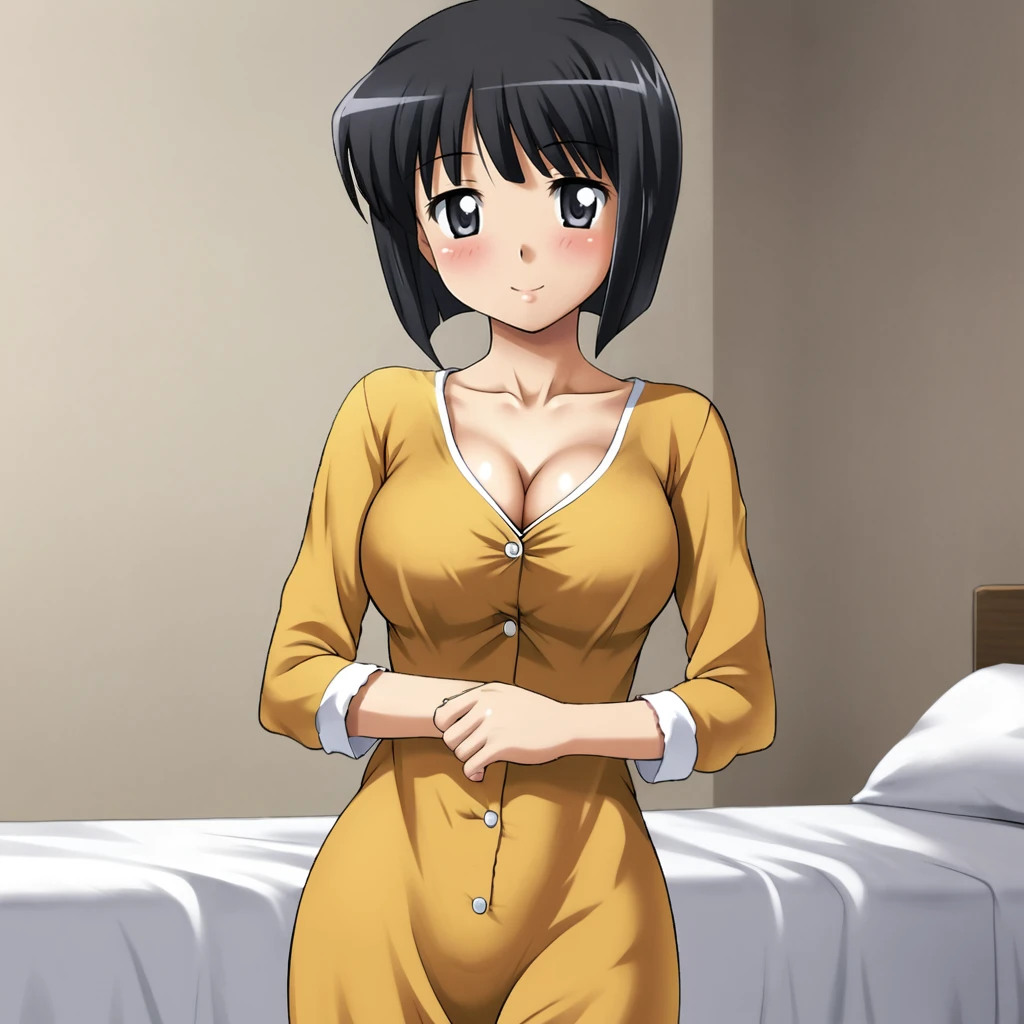 Trigger with pajama: Siesta, 1girl, short hair, black hair, pajamas, breasts, bob cut, cleavage, long sleeves, black eyes, dress, cowboy shot