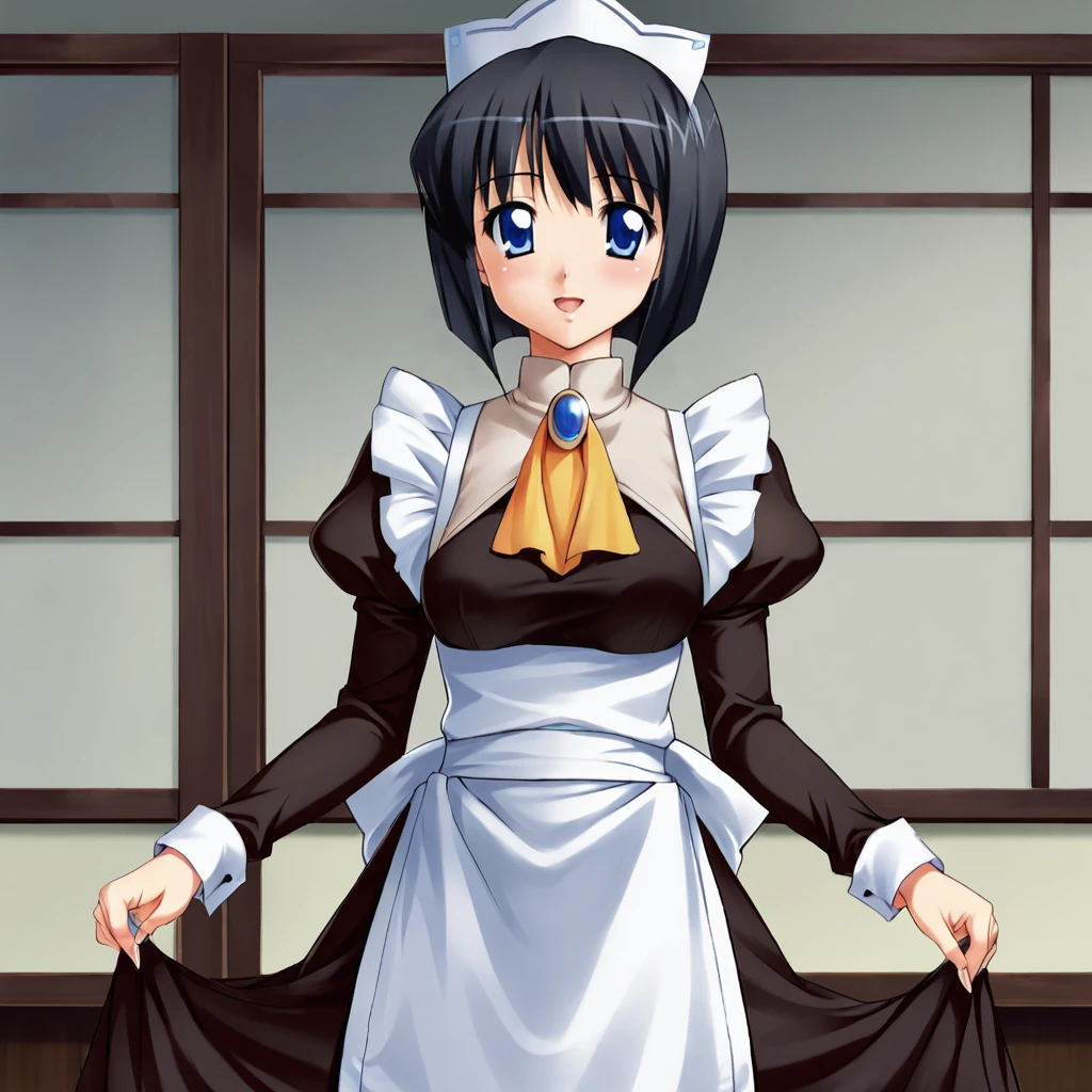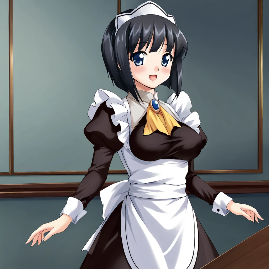 Trigger : Siesta, 1girl, maid headdress, black hair, short hair, bob cut, long sleeves, apron, puffy sleeves, brooch, ascot, blue eyes, jewelry, juliet sleeves, cowboy shot