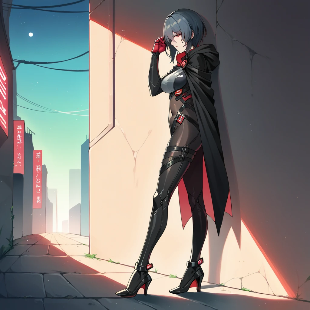 RvnHi3, Fol001, Rv_Def, short hair, black hair, red eyes, ahoge, hooded cloak, black cloak, black hood, black bodysuit, multiple belts, black belts, black straps, thigh straps, grey top, long sleeves, black sleeves, black gloves, turtleneck, thigh boots, black legwear, covered navel, black feather, red claws, black gauntlets, stomach cutout, black armor, black leotard, Optional: "hood up" or "hood down" your choice.