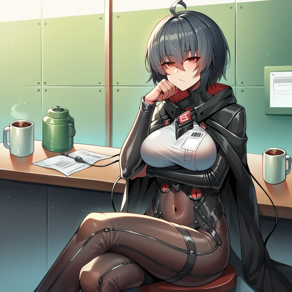 Raven, short hair, black hair, red eyes, hair between eyes, ahoge, Default Outfit: