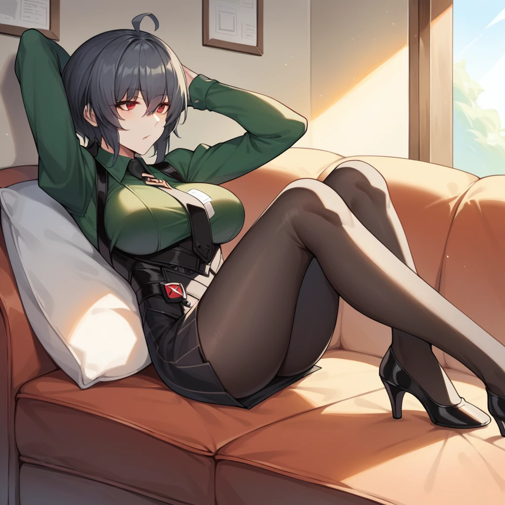 Raven_Suit, ponytail, green shirt, black skirt, collared shirt, puffy sleeves, black pantyhose, pantyhose, necktie, black necktie, Swimsuit Outfit: