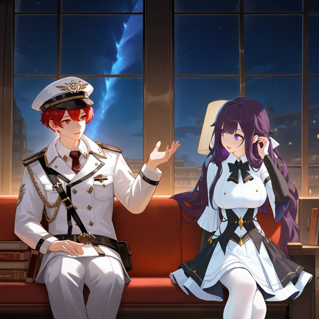CapHi3, 1boy, male focus, red hair, red eyes, short hair, military hat, peaked cap, white headwear, maroon necktie, military uniform, white jacket, button, buttons, collared shirt, white shirt, black trim, loose belt, belt pouch, white pants, white coat, coat on shoulders,Optional: You can remove the coat, simply remove "white coat, coat on shoulders,".