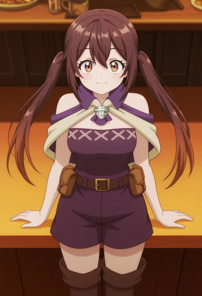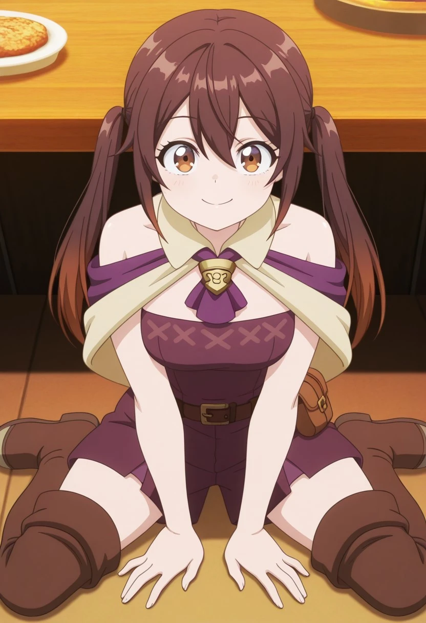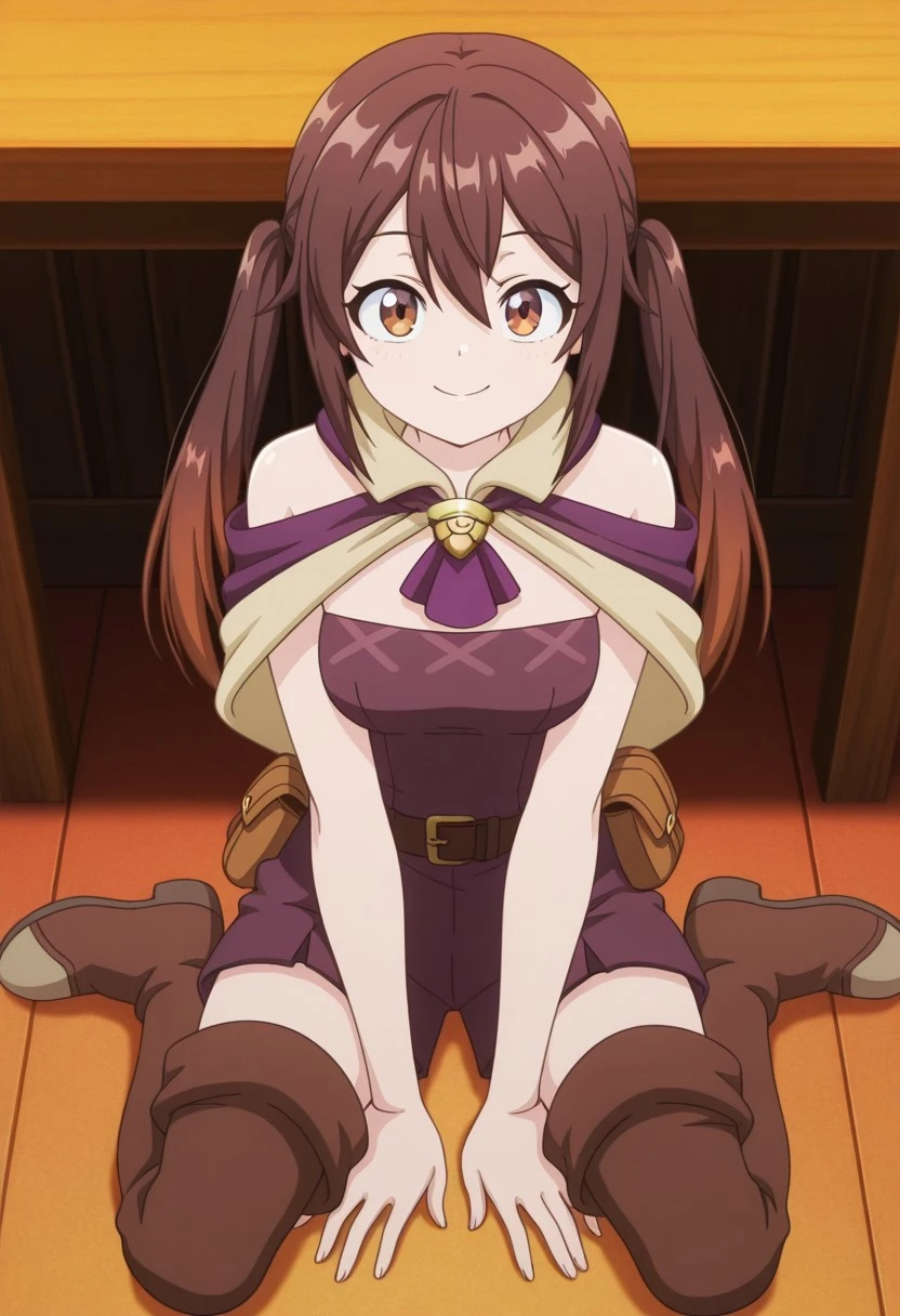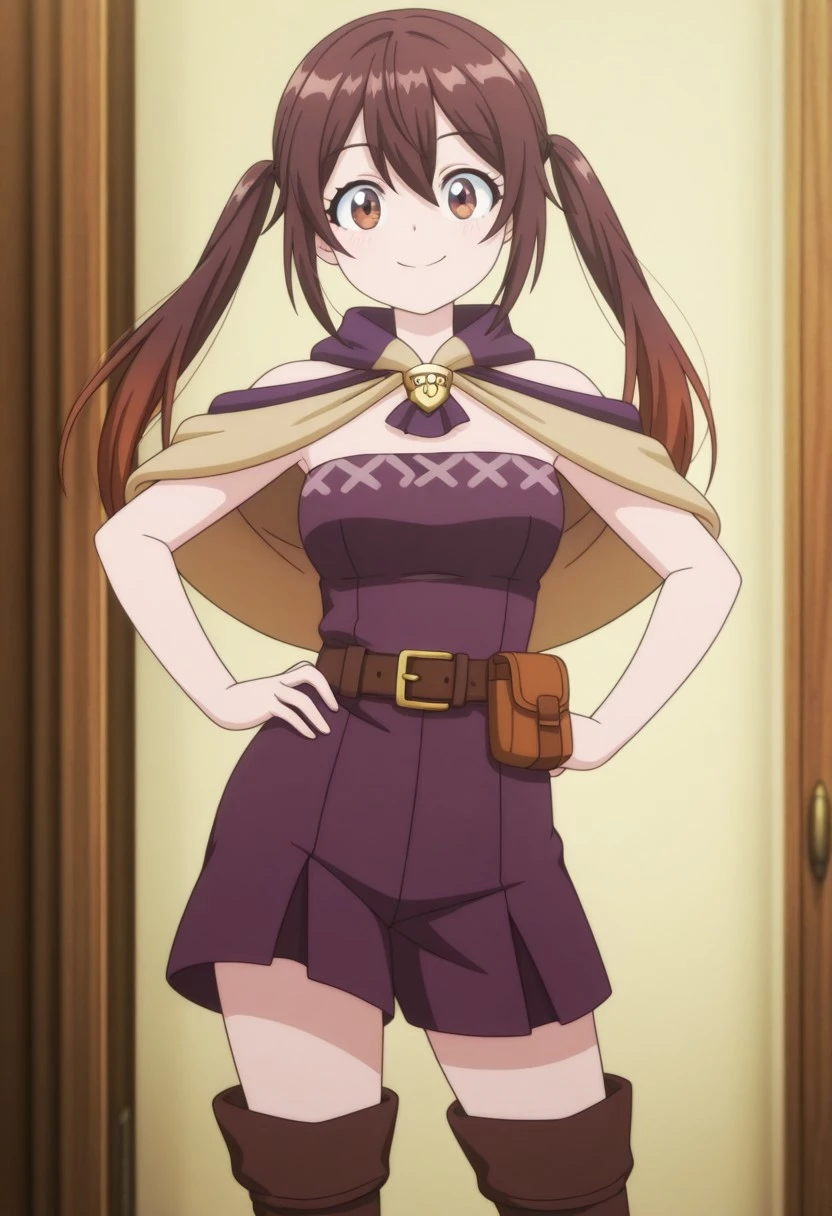 Base outfit : bare shoulders, , brown footwear, thigh boots, pouch,strapless, purple dress, brown belt, purple ascot , boots, capelet