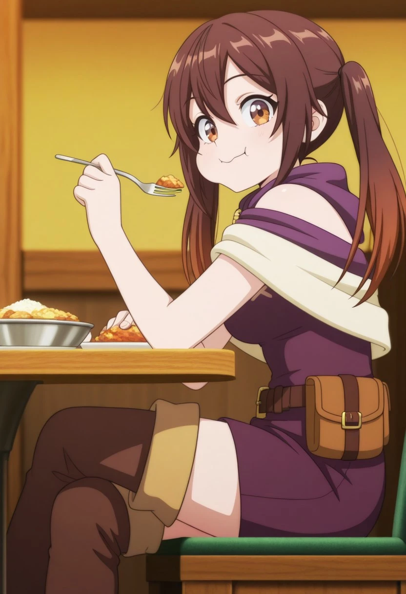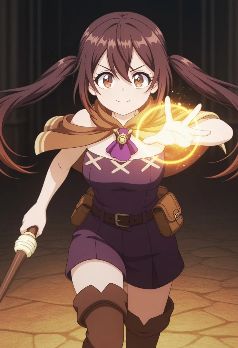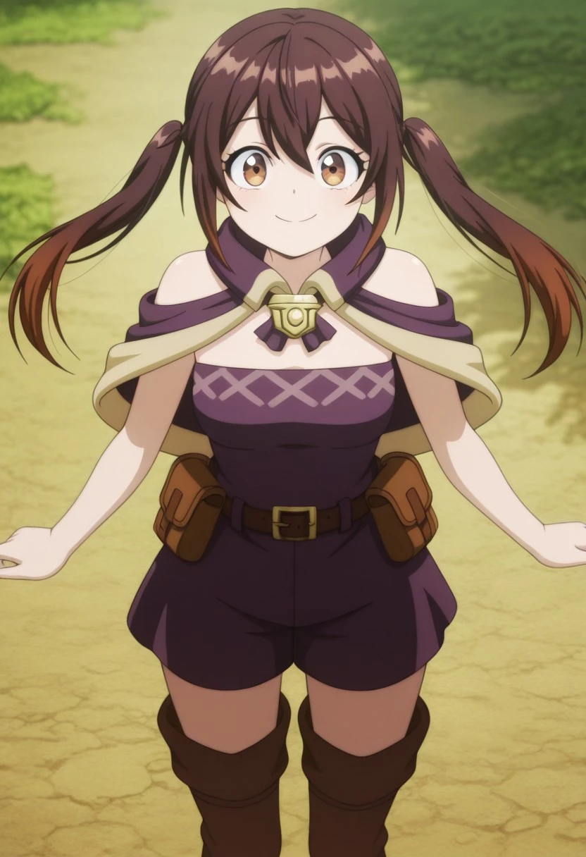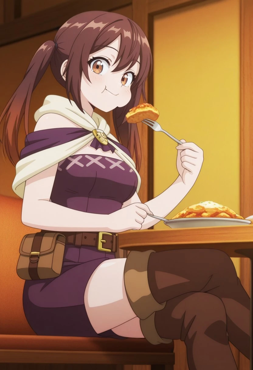 Base outfit : bare shoulders, , brown footwear, thigh boots, pouch,strapless, purple dress, brown belt, purple ascot , boots, capelet