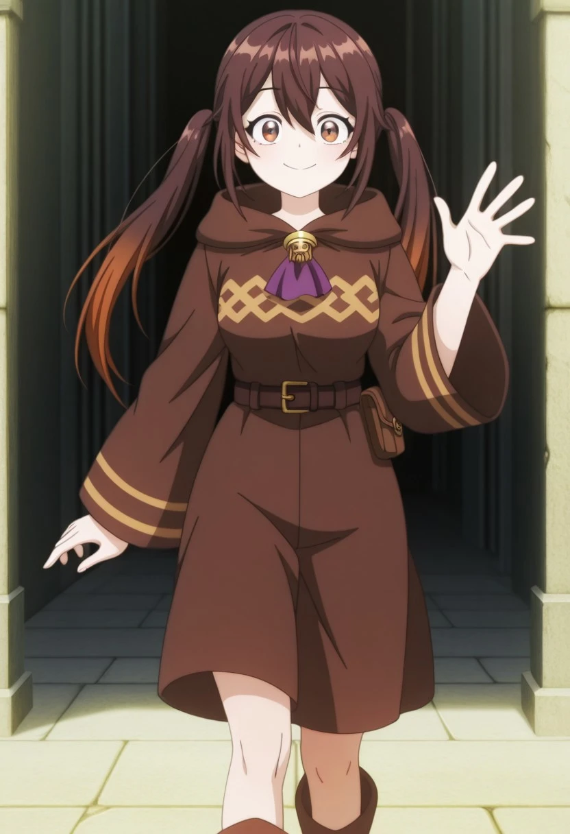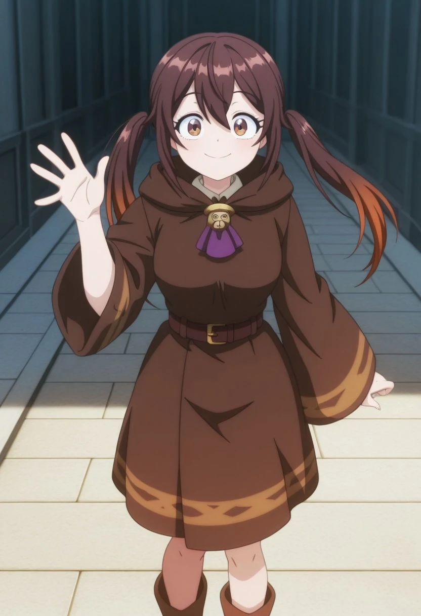 long sleeves, boots, hooded robe , brown robe, belt, wide sleeves, purple ascot