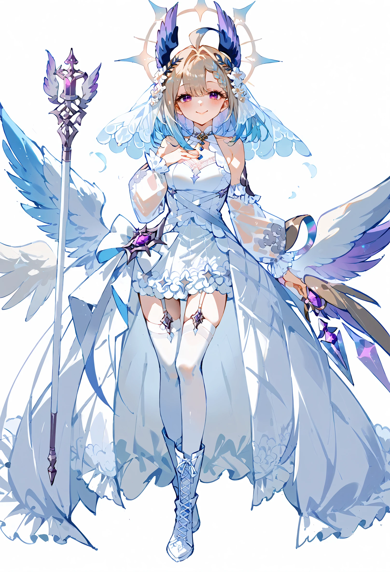 enna alouette (2nd costume), 1girl, head wings, multicolored hair, white dress, blue hair, purple eyes, hair ornament, smile, ahoge, knee boots, white background, detached sleeves, white thighhighs, holding staff, gradient hair, small breasts, hair flower, garter straps, white footwear, blonde hair, low wings, feathered wings, white flower, cross-laced footwear, see-through sleeves, sleeveless, lace-up boots, halo, cleavage, multiple wings, white veil