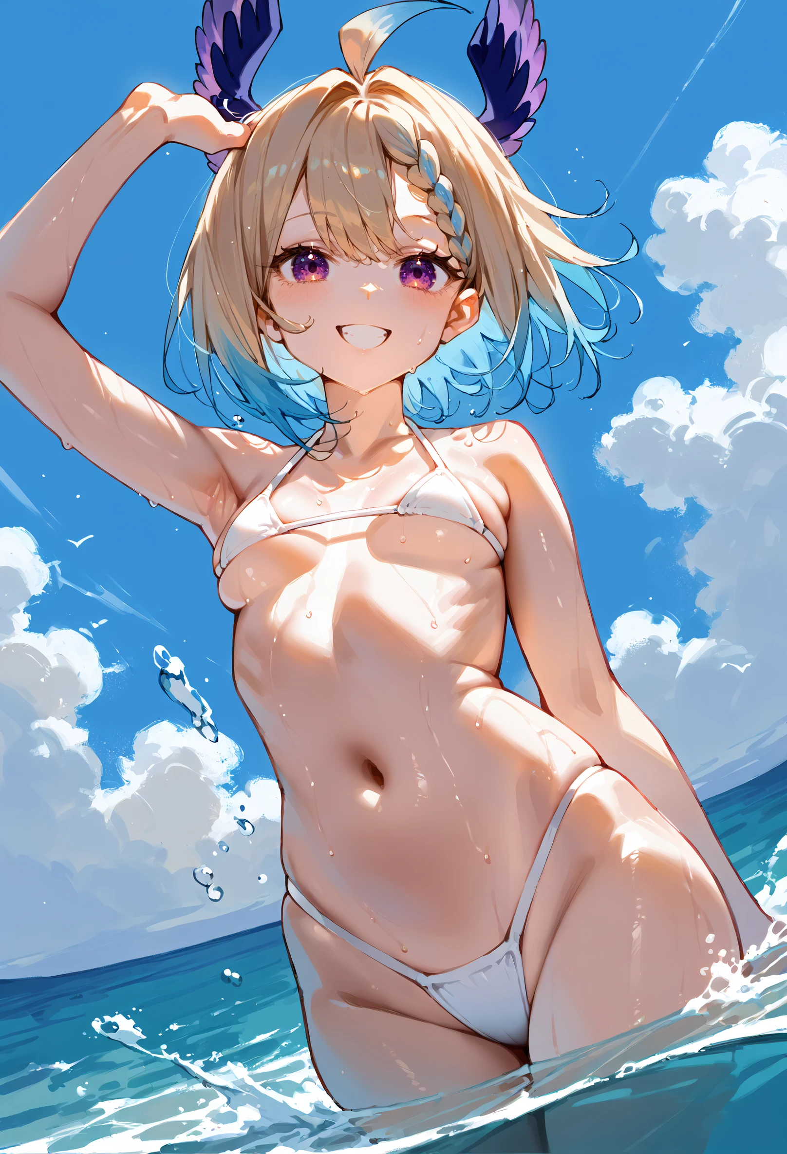 Short hair only: enna alouette, 1girl, head wings, purple eyes, blue hair, multicolored hair, ahoge, blonde hair, braid, gradient hair, small breasts