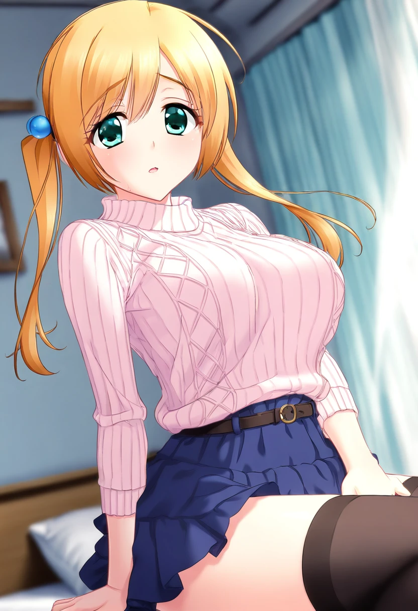 ribbed sweater, blue skirt, black thighhighs