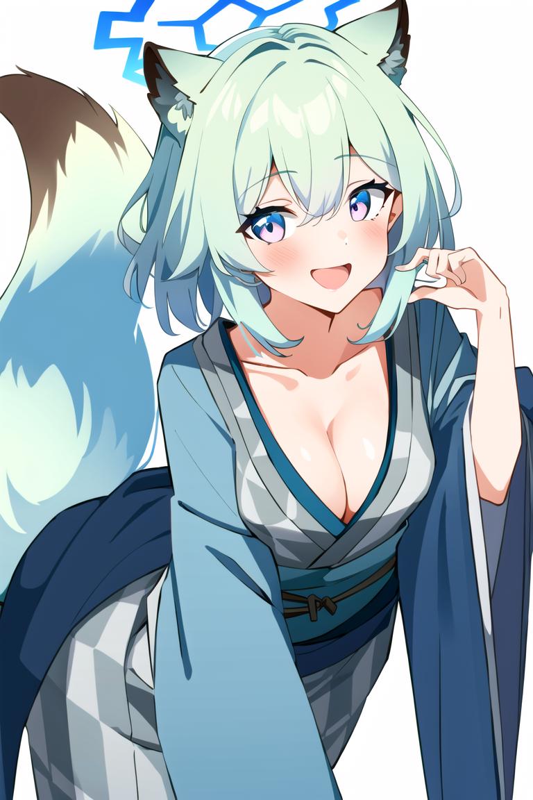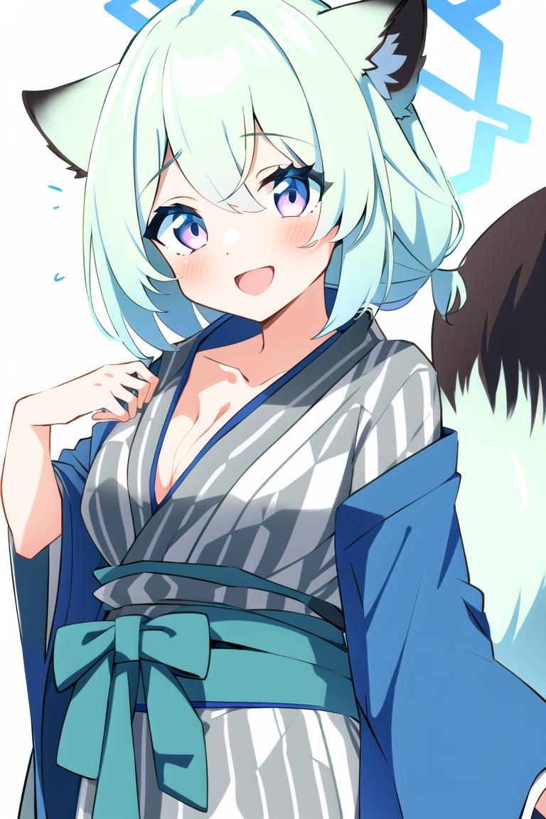 If you want onsen cloth, add following tags: mayoi shigure, bangs, tail, japanese clothes, wide sleeves, pink eyes, official alternate costume, halo, obi, multicolored eyes, light green hair, yagasuri, grey kimono, bath yukata, weasel ears