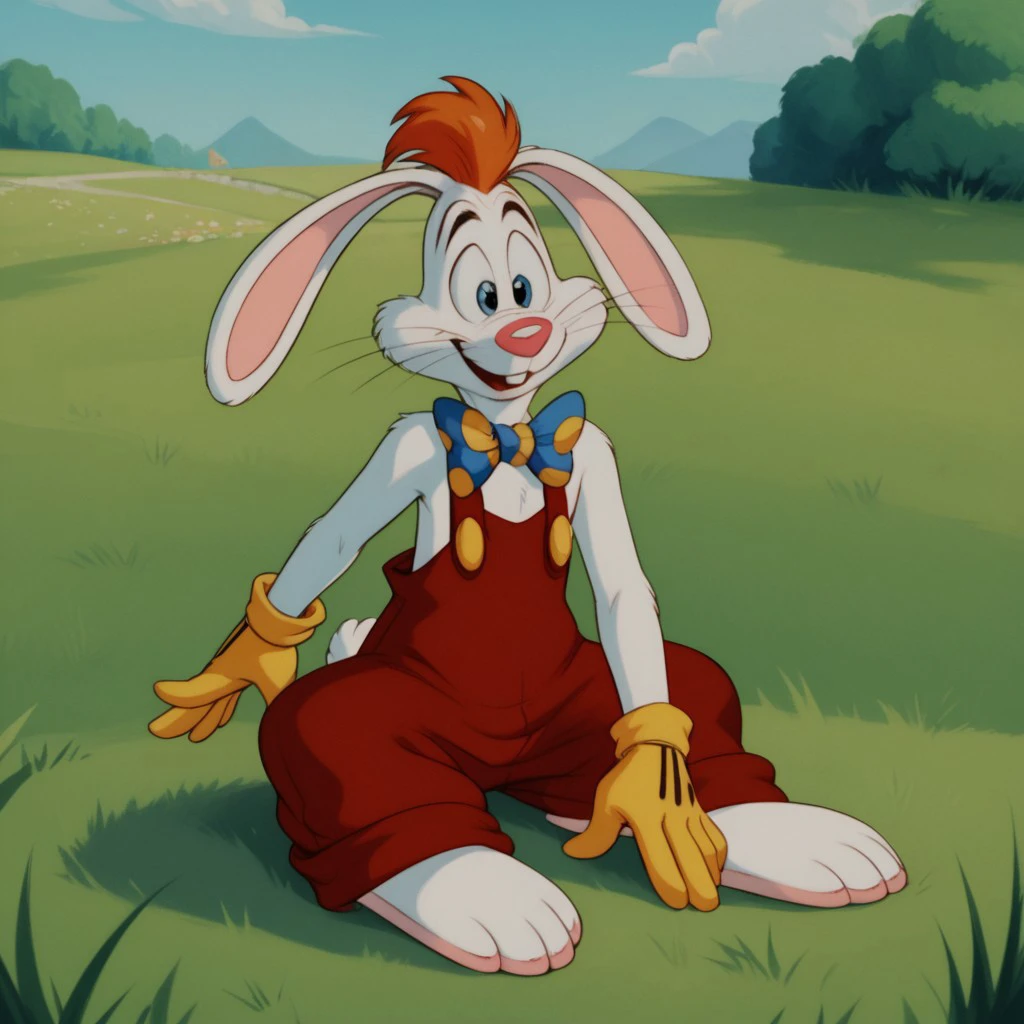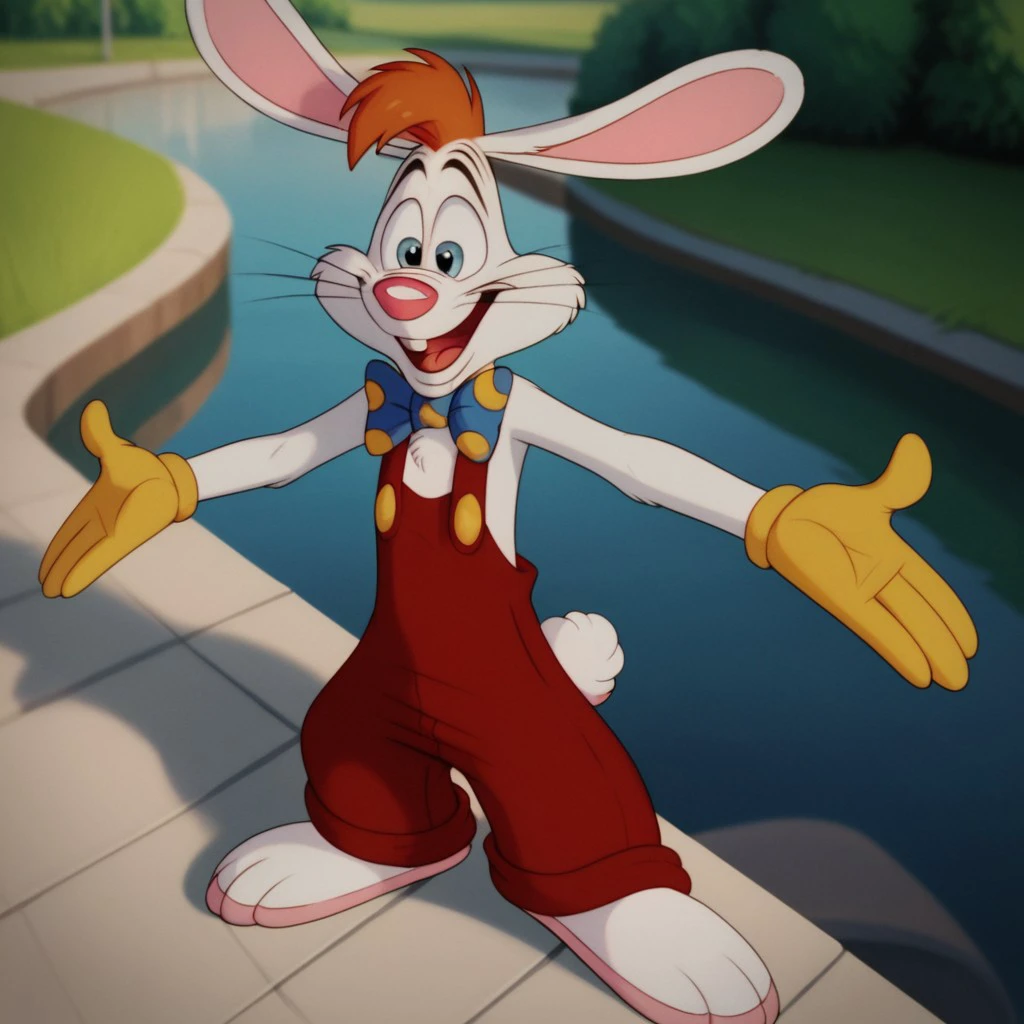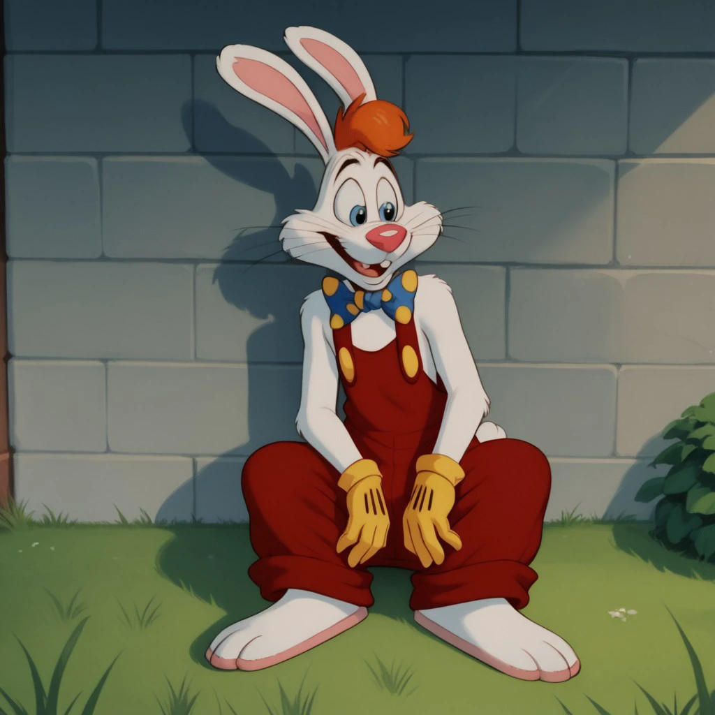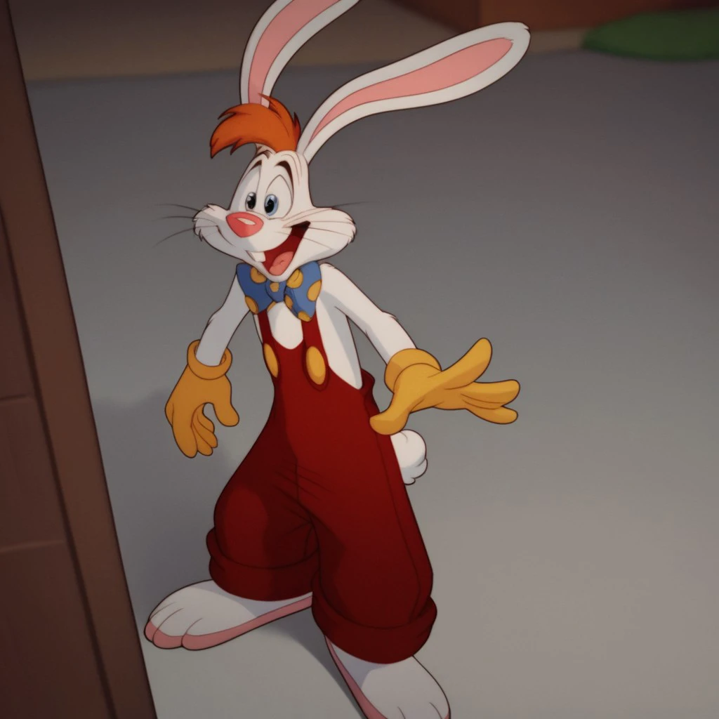 Rogerrbbt, anthro, male, rabbit, rabbit ears, white fur, orange hair, red overalls, buck teeth, bowtie, yellow gloves,