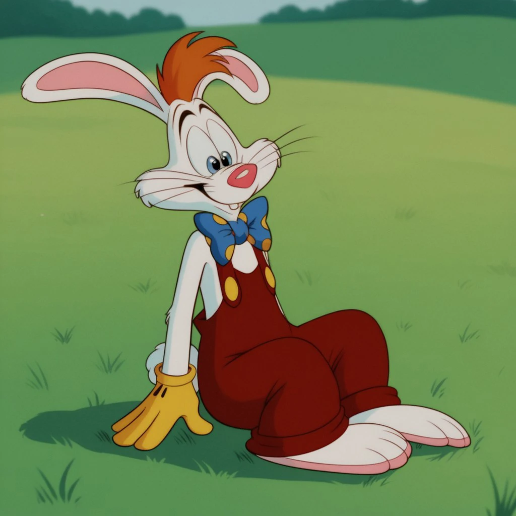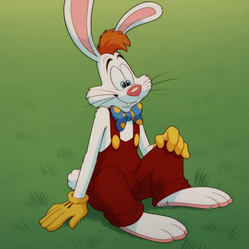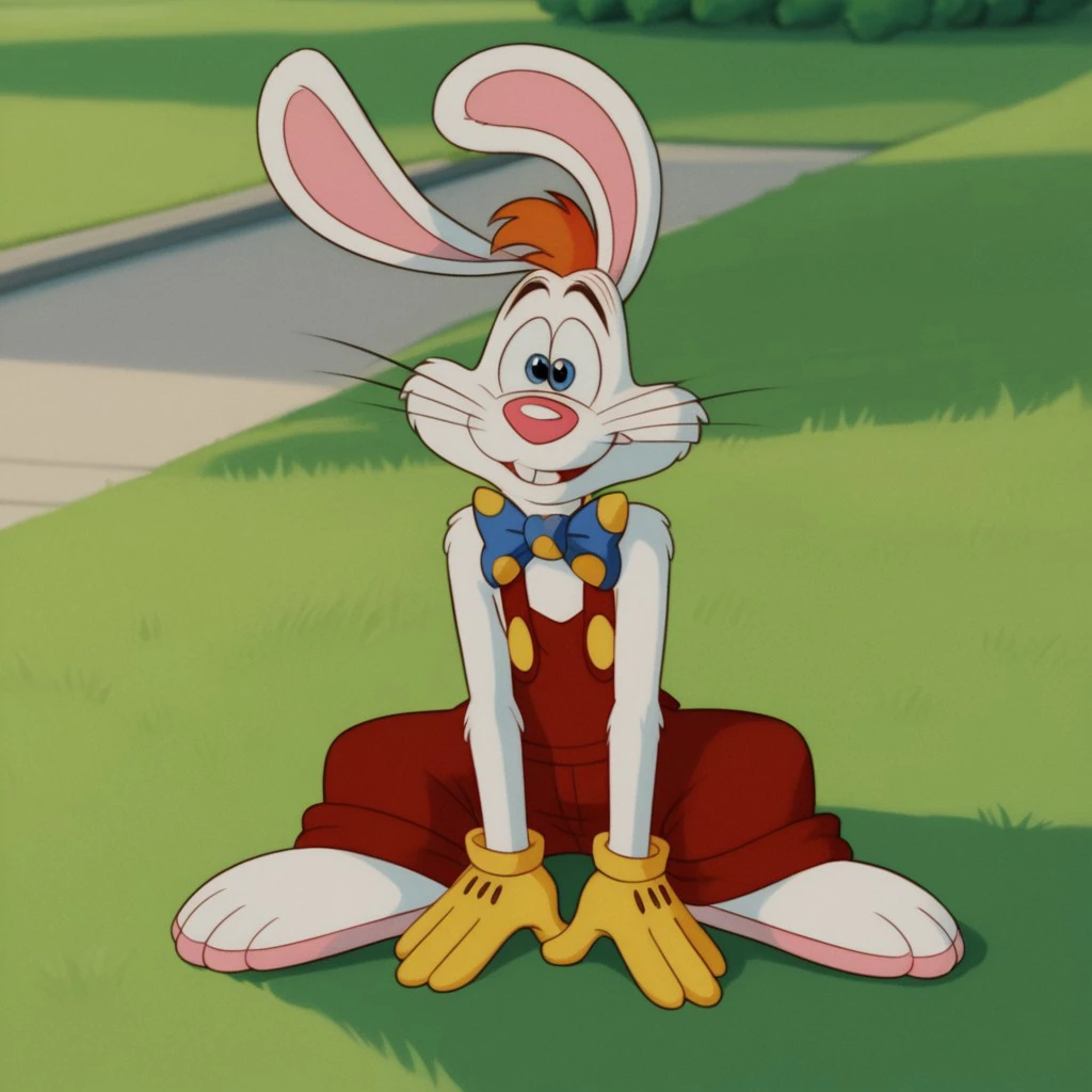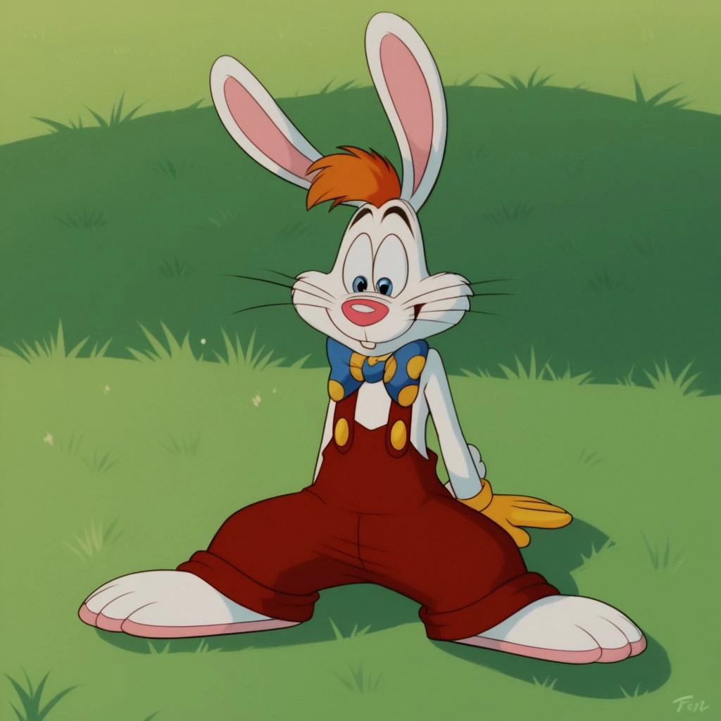 Rogerrbbt, anthro, male, rabbit, rabbit ears, white fur, orange hair, red overalls, buck teeth, bowtie, yellow gloves,