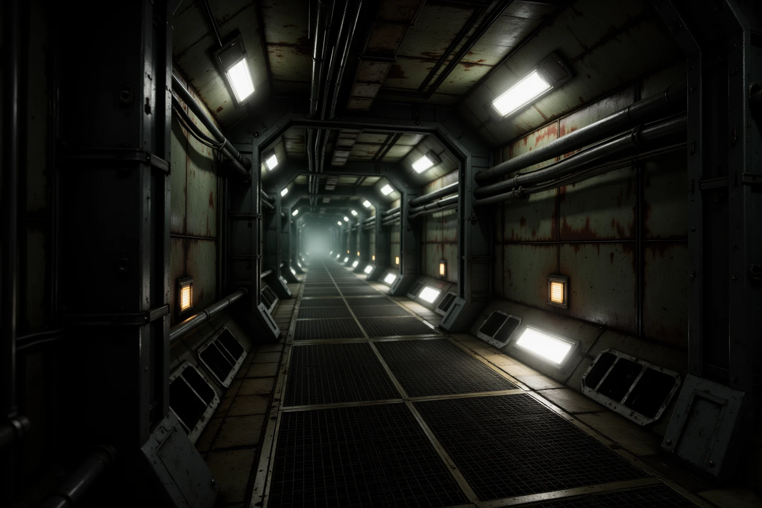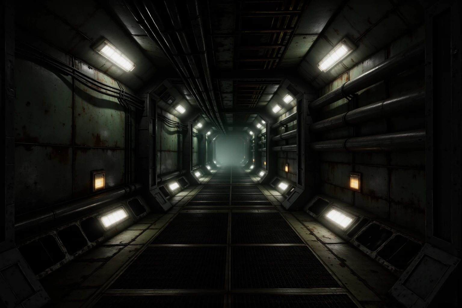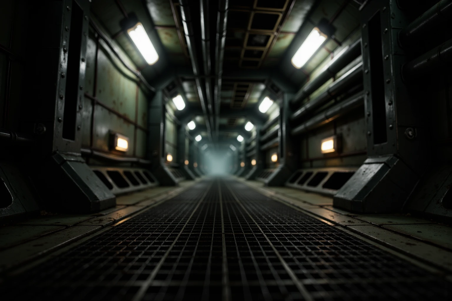 Industrial Spacecraft Corridor, cinematic ultra-realistic aging spacecraft hallway, long symmetrical corridor narrowing into fog-filled vanishing point, claustrophobic enclosed architecture, matte oxidized green steel walls with corrosion, rivets and welded seams, thick oily black pipes running horizontally on both sides, bundled ceiling cables and exposed conduit clusters, modular ribbed mechanical ceiling panels, inset cold white fluorescent strip lights, dark grated metal floor panels with thin drifting vapor pooling mid-depth, bright rectangular floor-level neon panels casting white light with subtle green tint, occasional dim red and muted amber indicator lights along walls, atmospheric haze, recycled contaminated air mood, cold cyan spill, deep industrial green and blackened metal palette, tense analog-heavy retro sci-fi environment