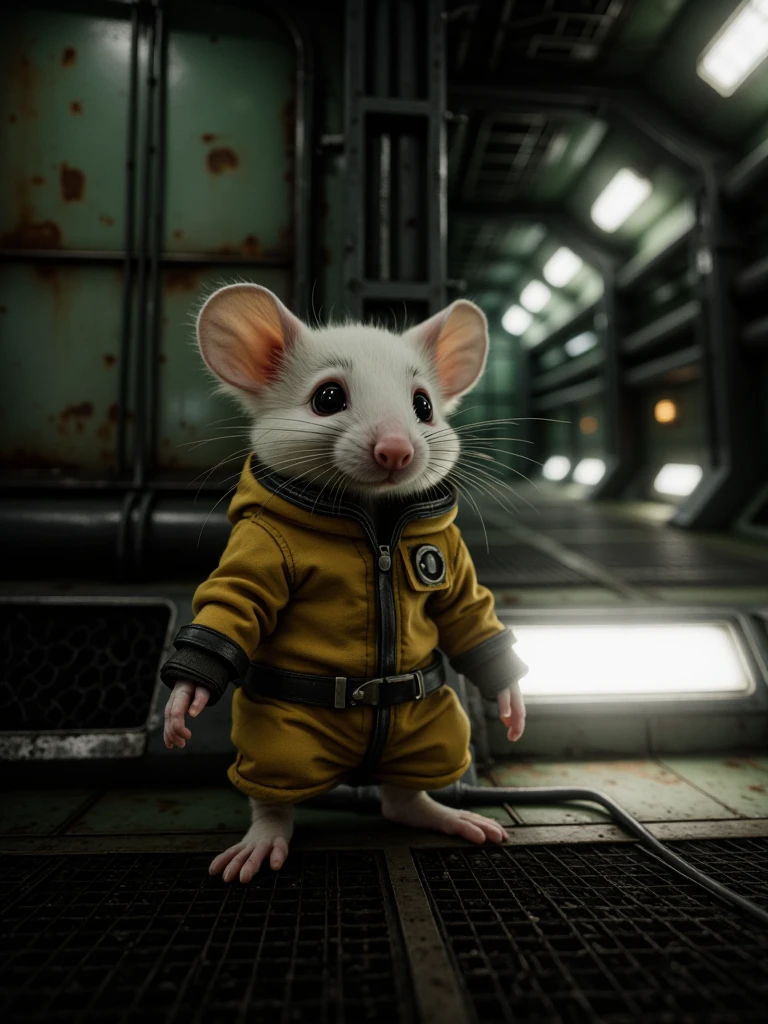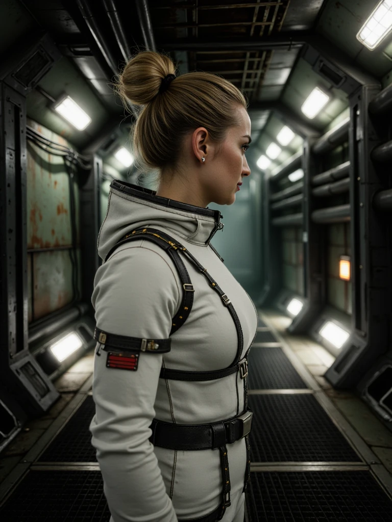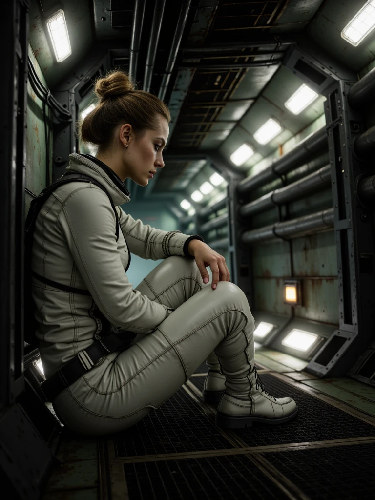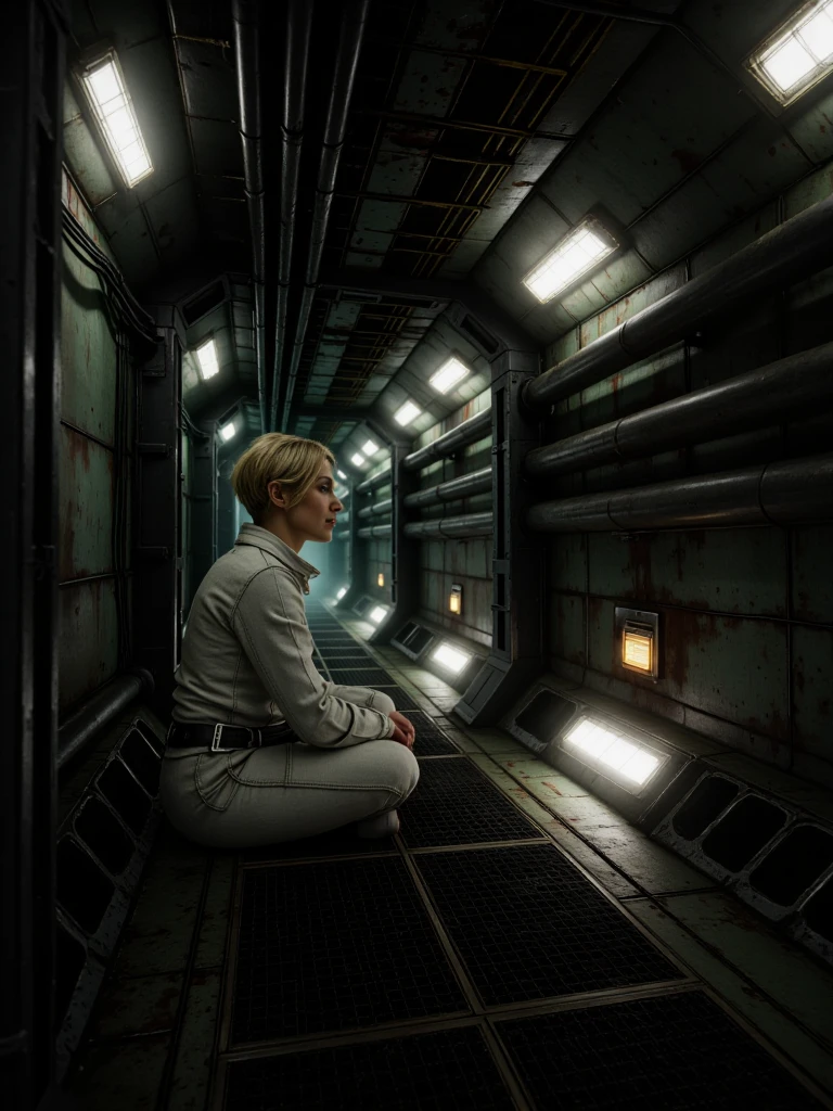 Industrial Spacecraft Corridor, cinematic ultra-realistic aging spacecraft hallway, long symmetrical corridor narrowing into fog-filled vanishing point, claustrophobic enclosed architecture, matte oxidized green steel walls with corrosion, rivets and welded seams, thick oily black pipes running horizontally on both sides, bundled ceiling cables and exposed conduit clusters, modular ribbed mechanical ceiling panels, inset cold white fluorescent strip lights, dark grated metal floor panels with thin drifting vapor pooling mid-depth, bright rectangular floor-level neon panels casting white light with subtle green tint, occasional dim red and muted amber indicator lights along walls, atmospheric haze, recycled contaminated air mood, cold cyan spill, deep industrial green and blackened metal palette, tense analog-heavy retro sci-fi environment
