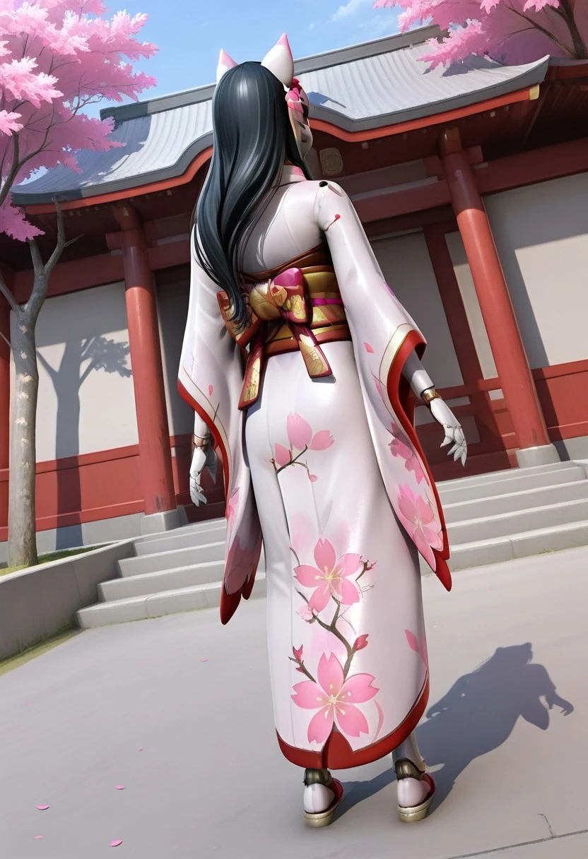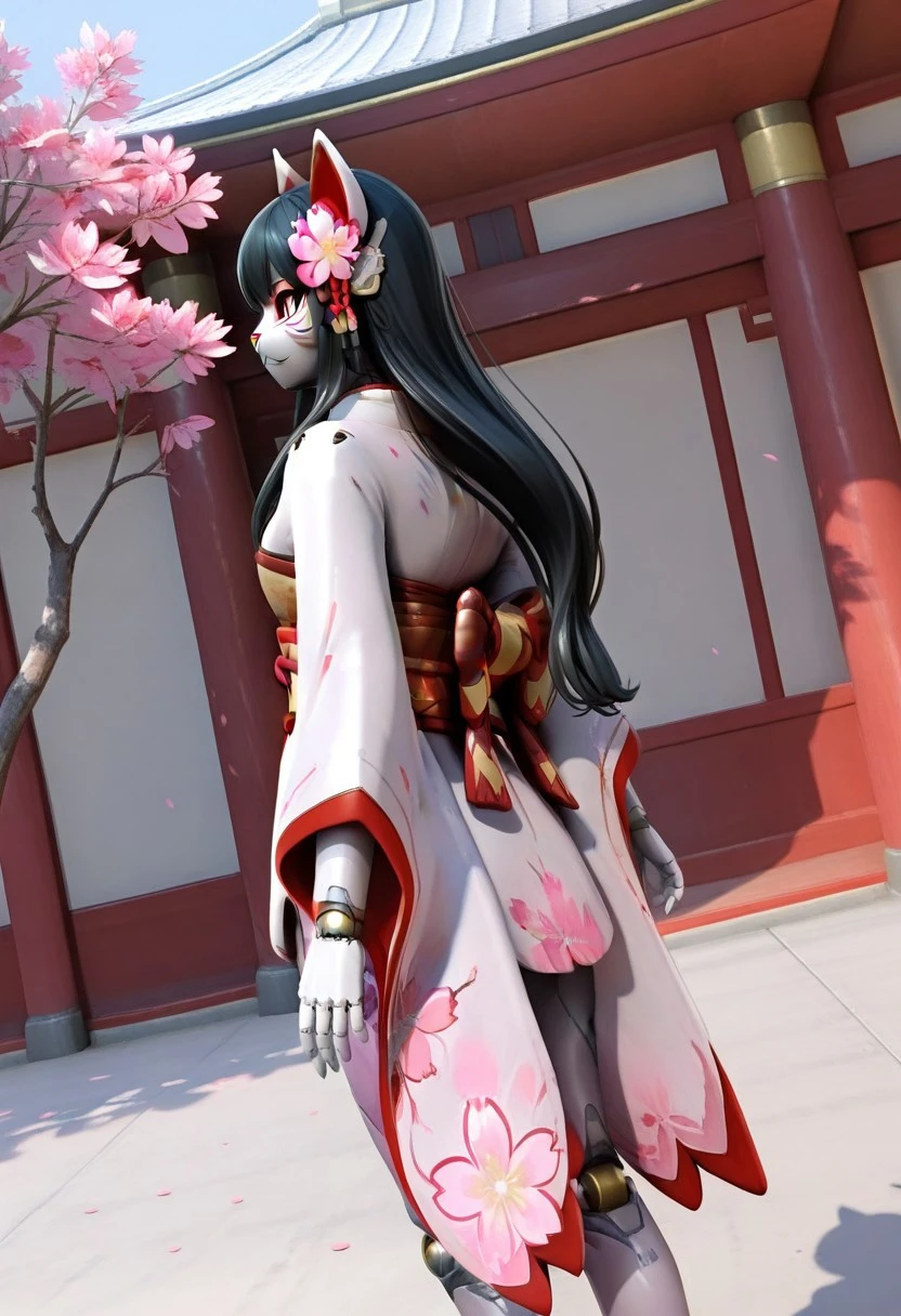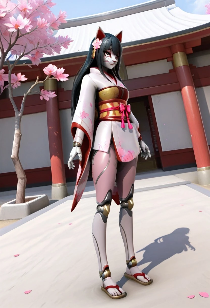 Recommended Prompt: Inari, White mask (kitsune mask), Long black hair, Android, Synthetic skin, Robot girl, Non-human texture, Smooth surface, Shiny accents.