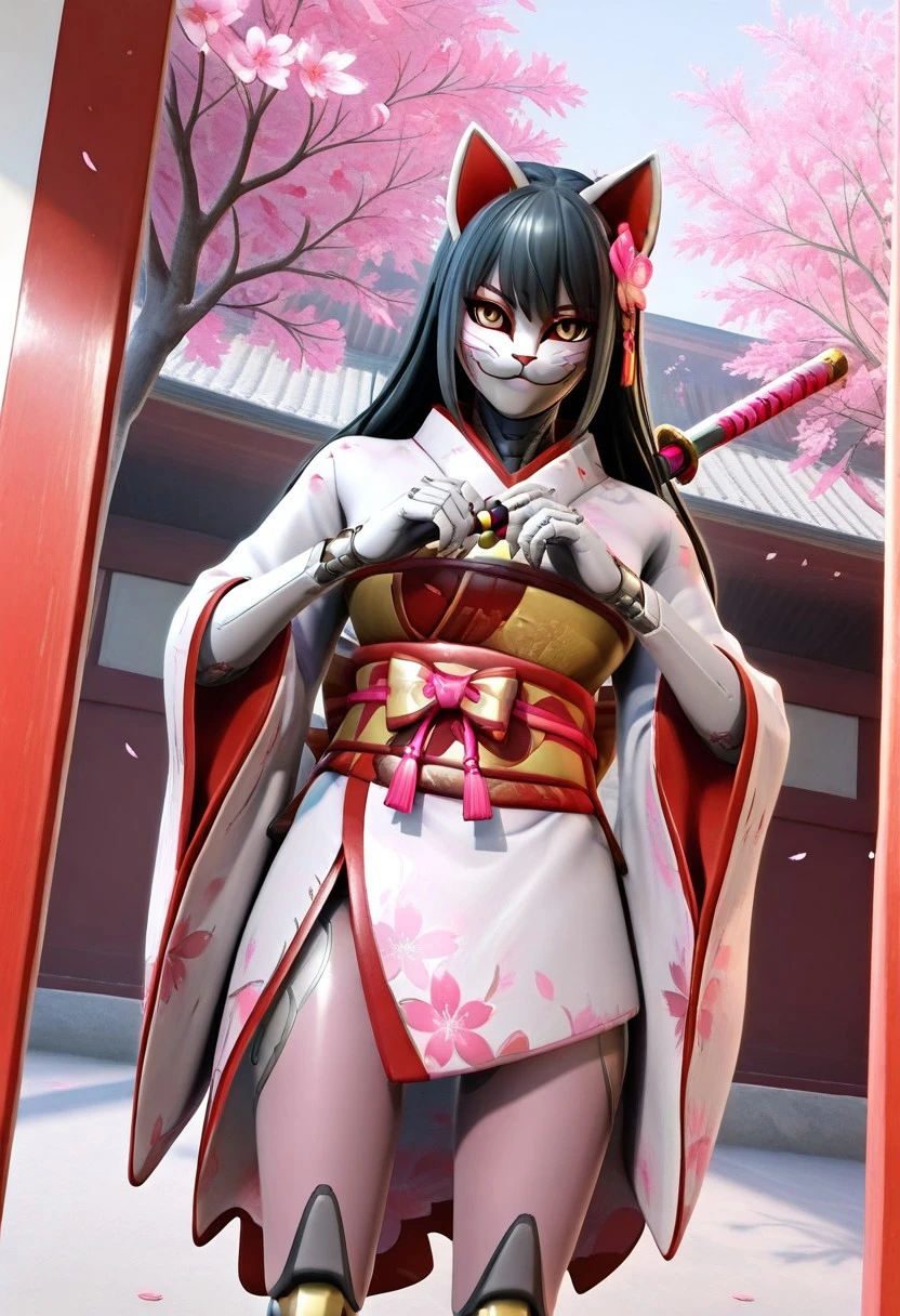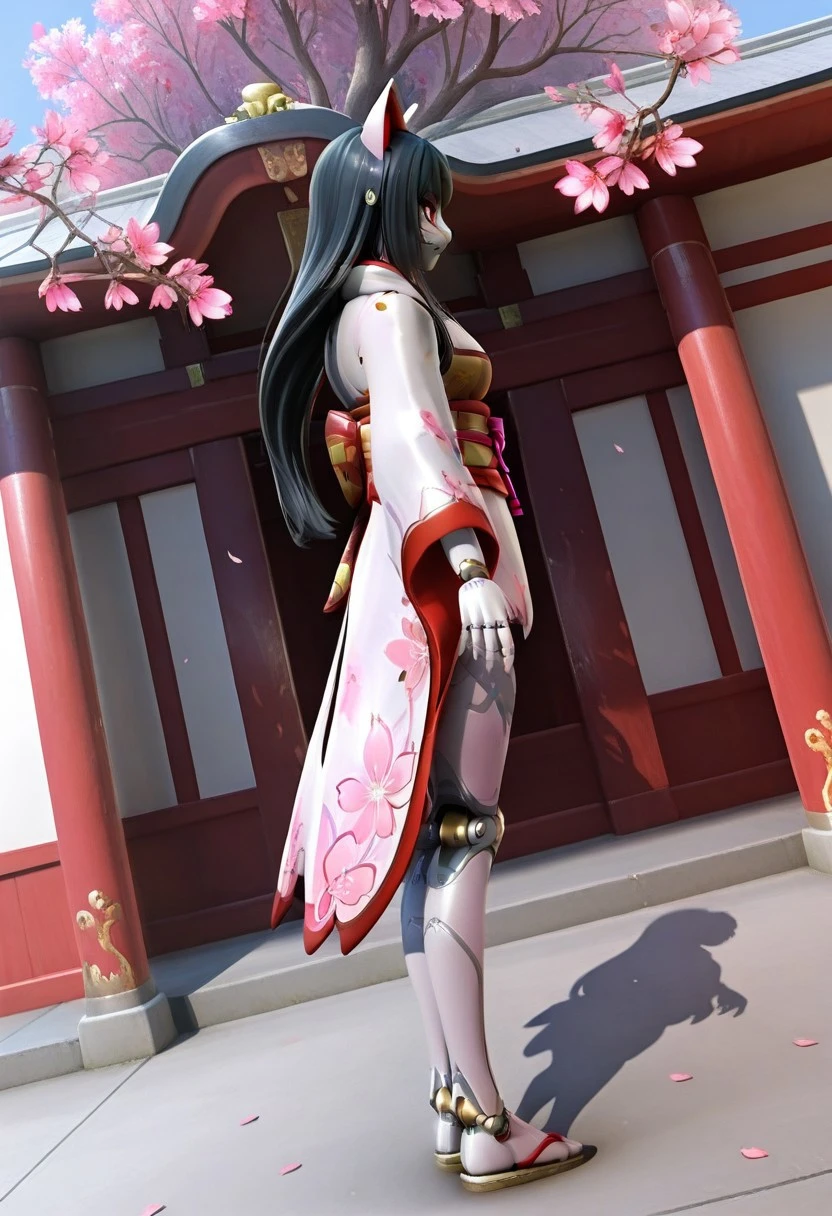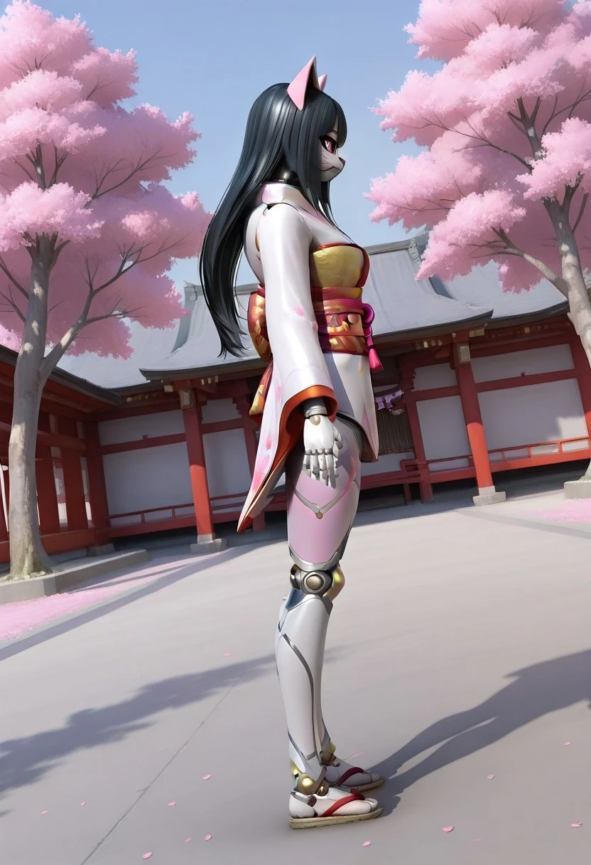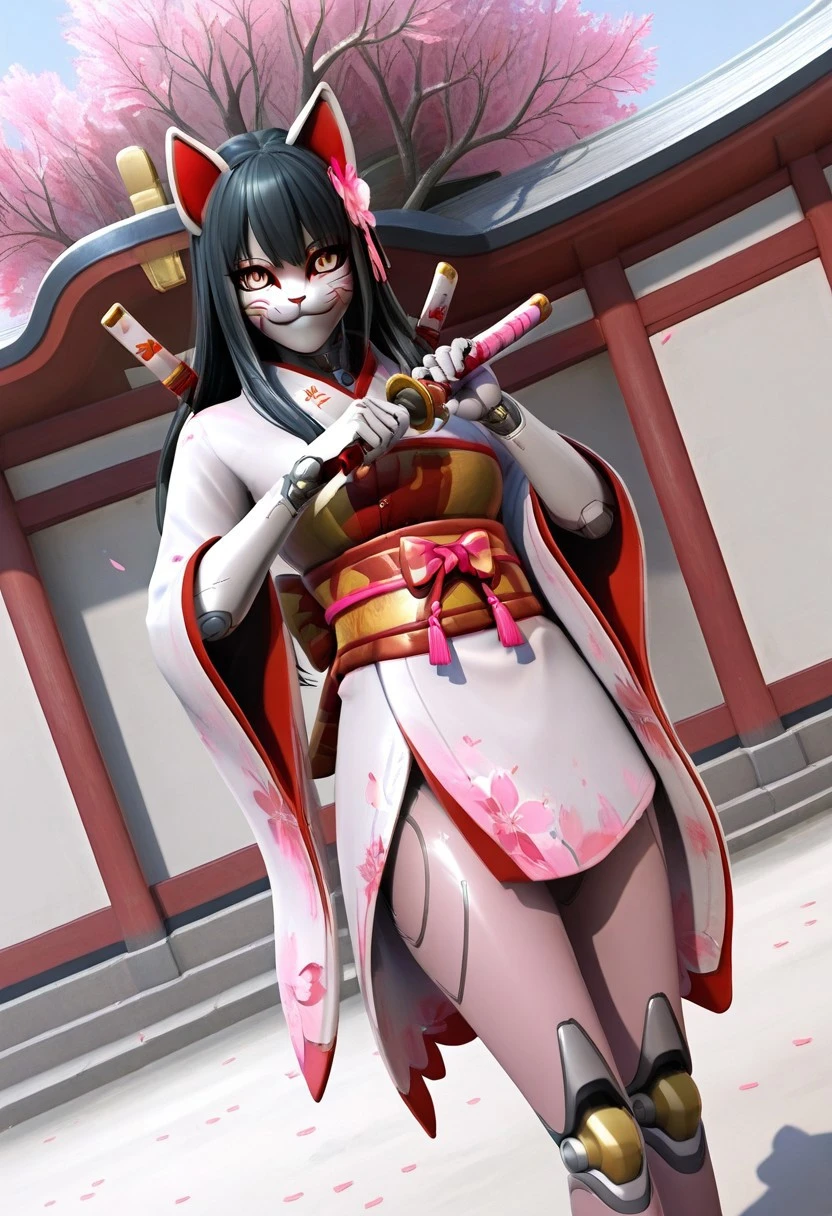Recommended Prompt: Inari, White mask (kitsune mask), Long black hair, Android, Synthetic skin, Robot girl, Non-human texture, Smooth surface, Shiny accents.