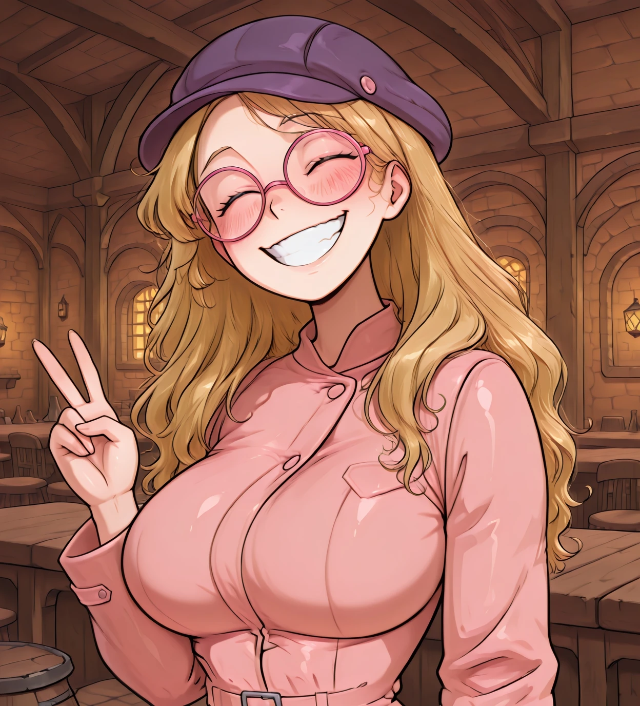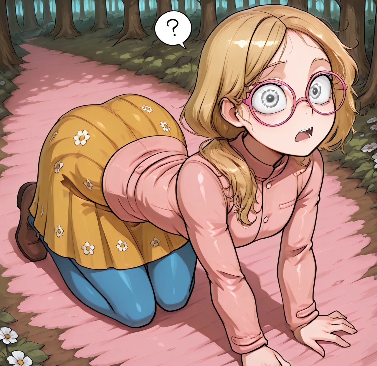 pink coat, pink glasses, yellow skirt, flower pattern skirt, blue pantyhoseDescription