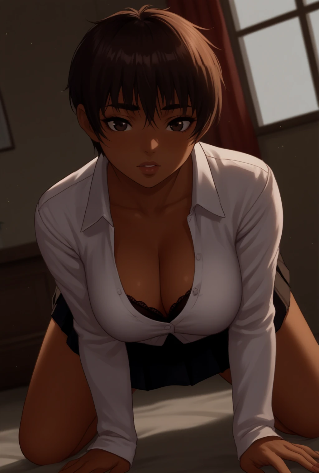 Outfit 1: ["Casca_Def, brown eyes, brown hair, short hair, thigh boots, gloves, boots, cape, thighhighs, dark-skinned female, breastplate, skirt, lips, red scarf, brown footwear, shoulder armor"]
