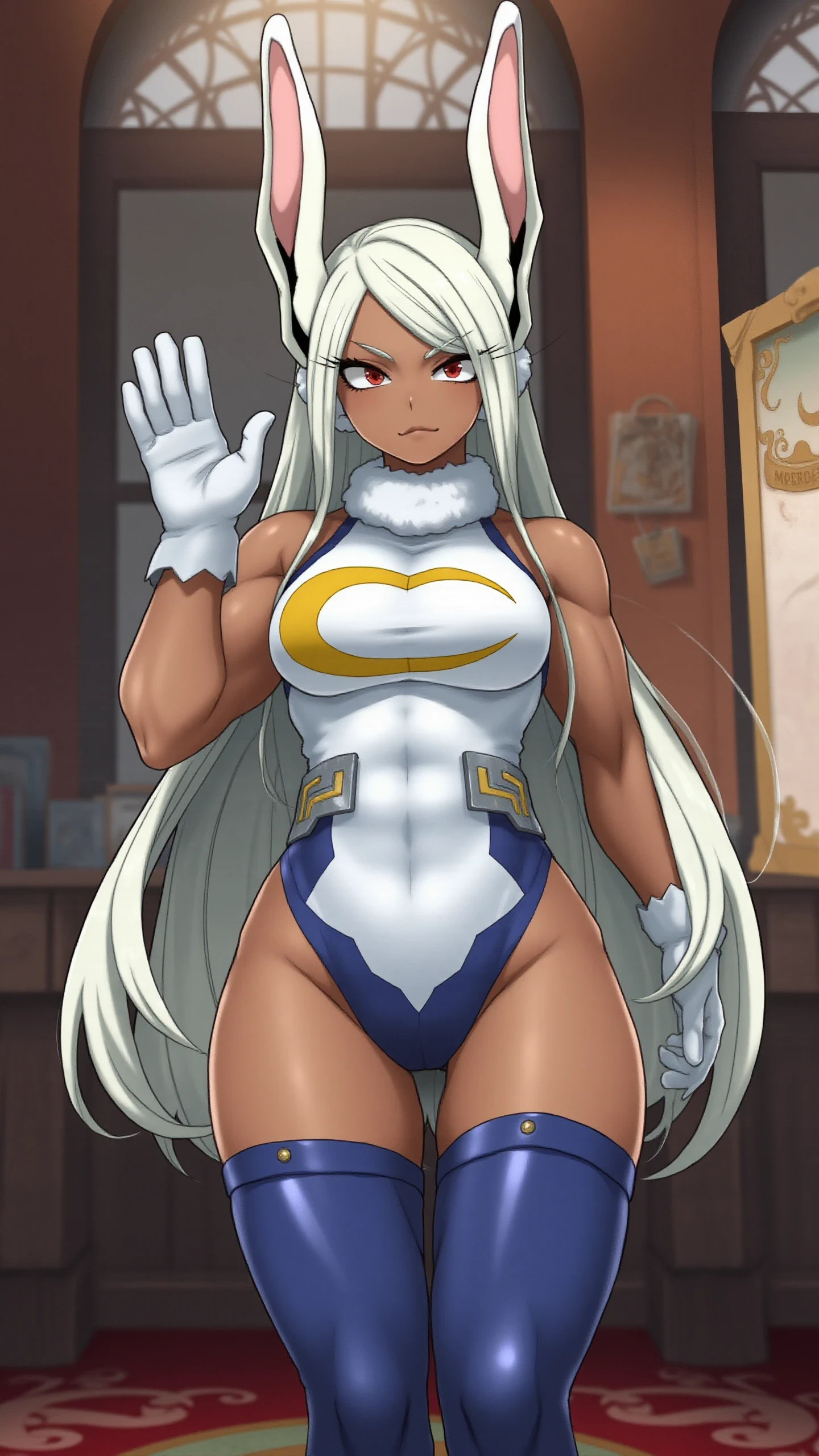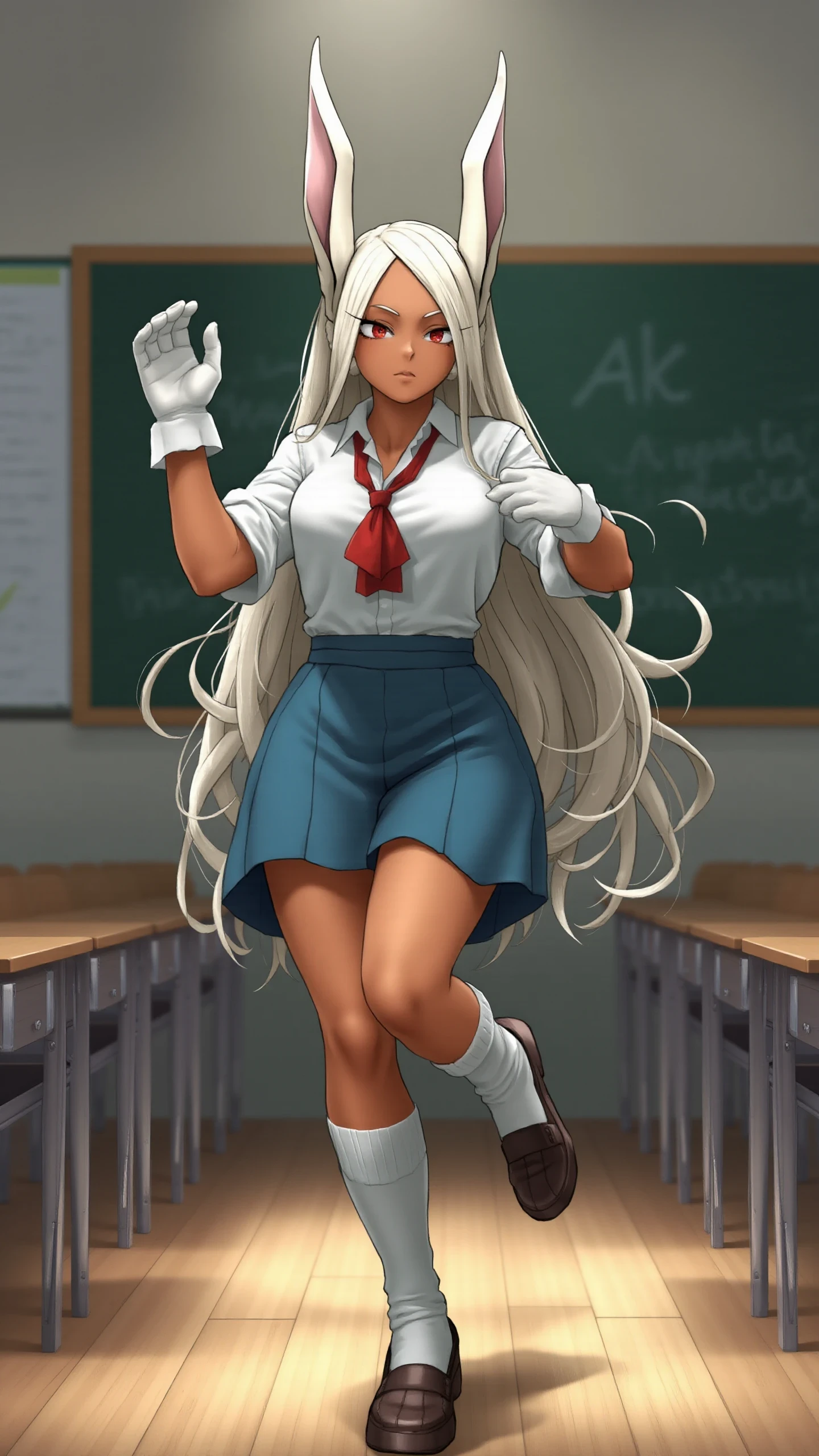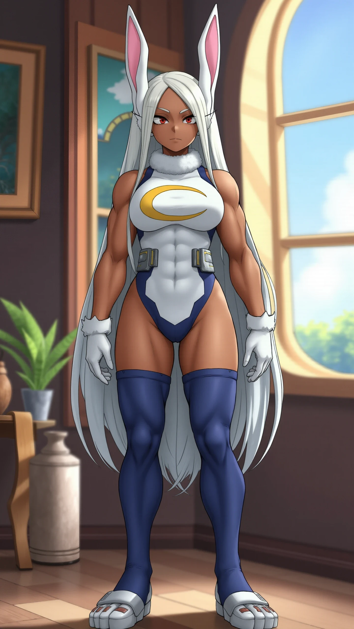 Appeareance: M1rko, long hair, animal ears, white hair, dark skin, rabbit ears, dark-skinned female, muscular, rabbit girl, muscular female, red eyes, parted bangs