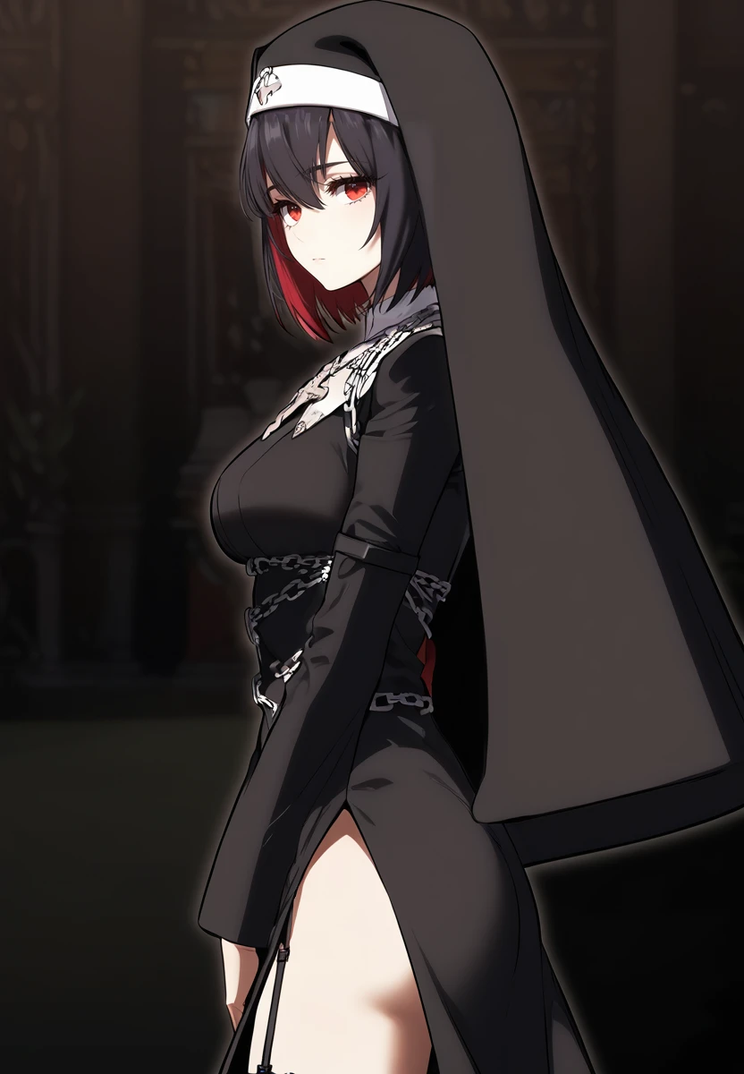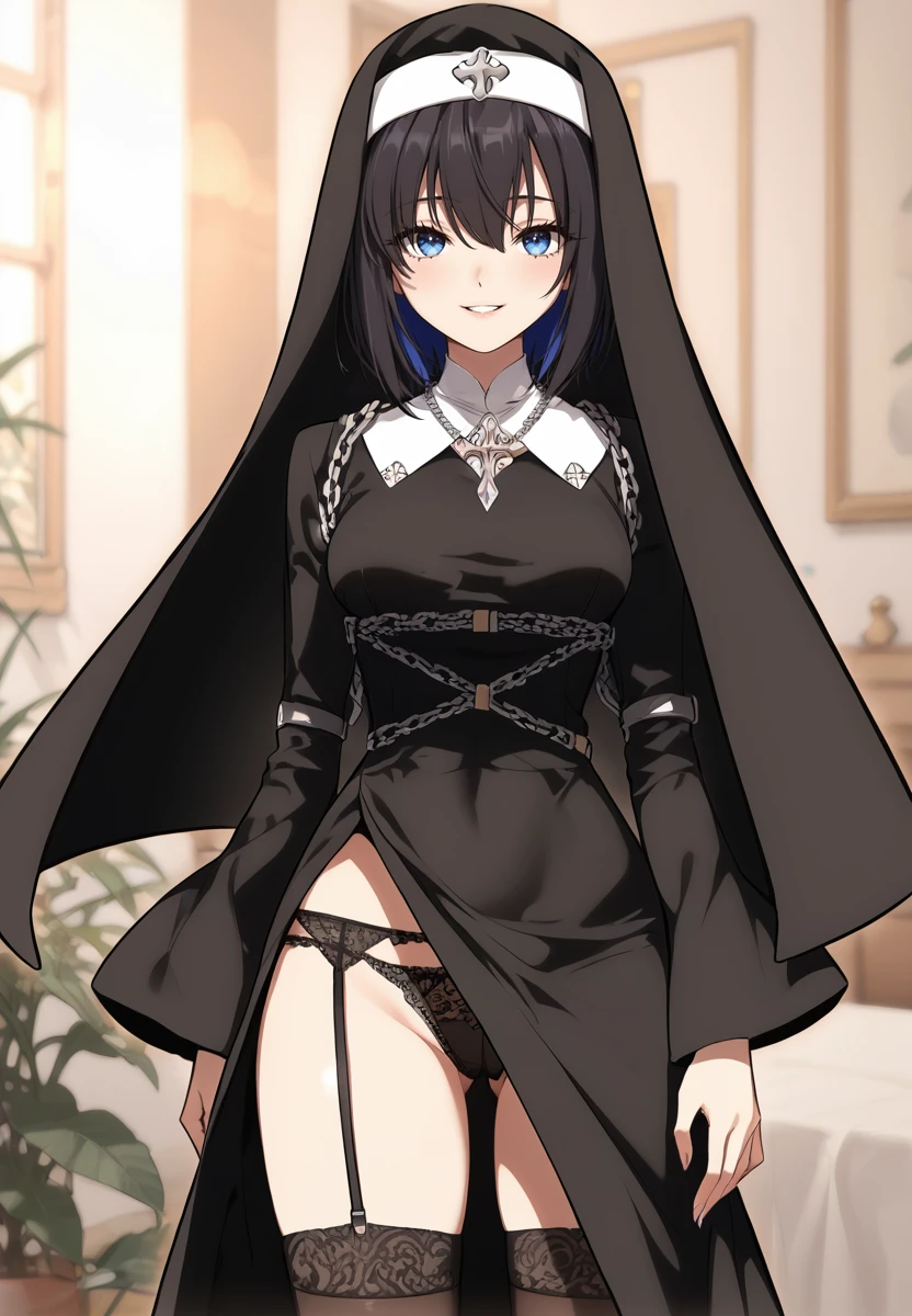 ran, 1girl, blue eyes, black hair, blue hair, multicolored hair, short hairthighhighs, habit, dress, chain, black thighhighs, black dress, cross, necklaceUse Adetailer