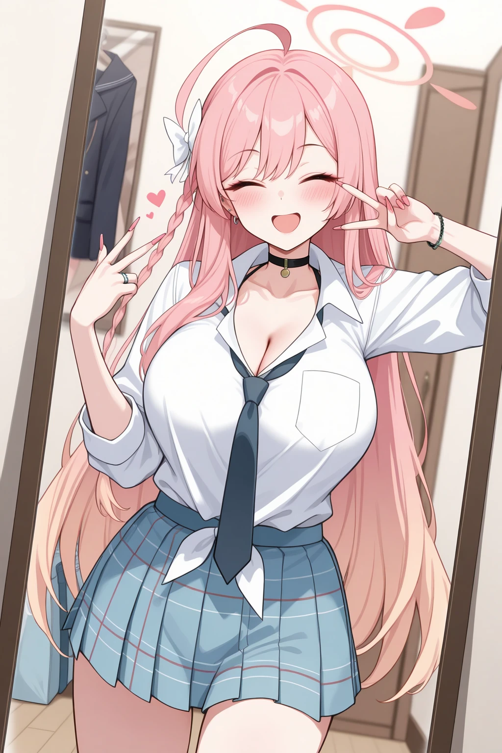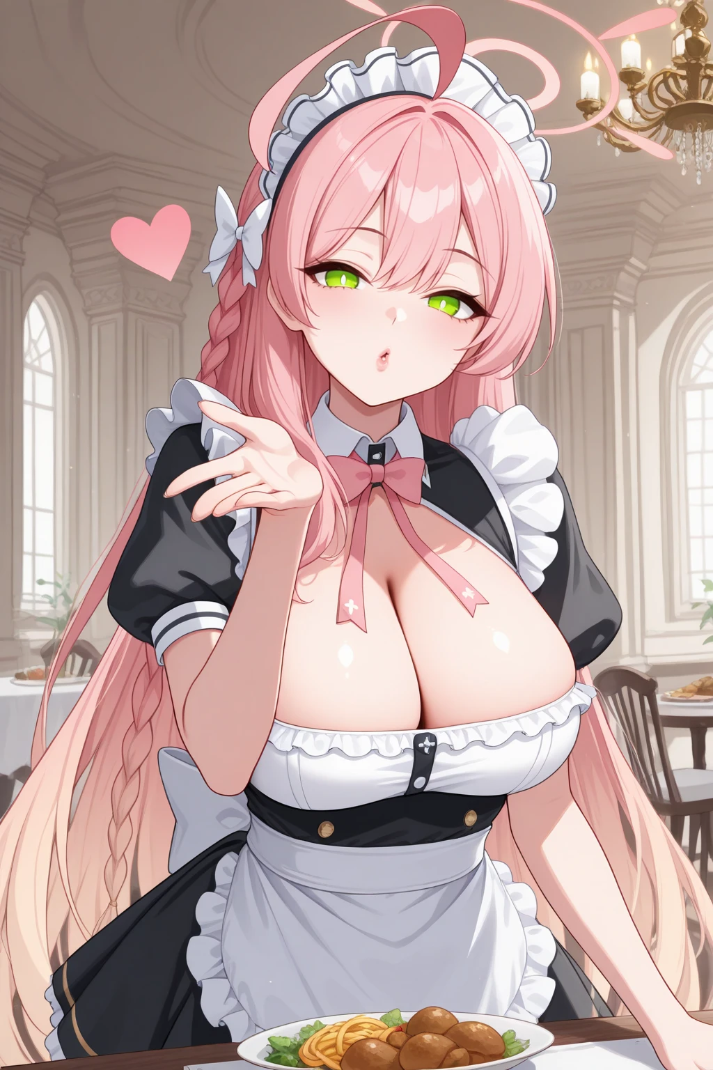 Appearance : h4nak0, large breasts, pink halo, green eyes, bright pupils, gradient hair, pink hair, double-parted bangs, hair between eyes, ahoge, very long hair, side braid, hair bow, white bow