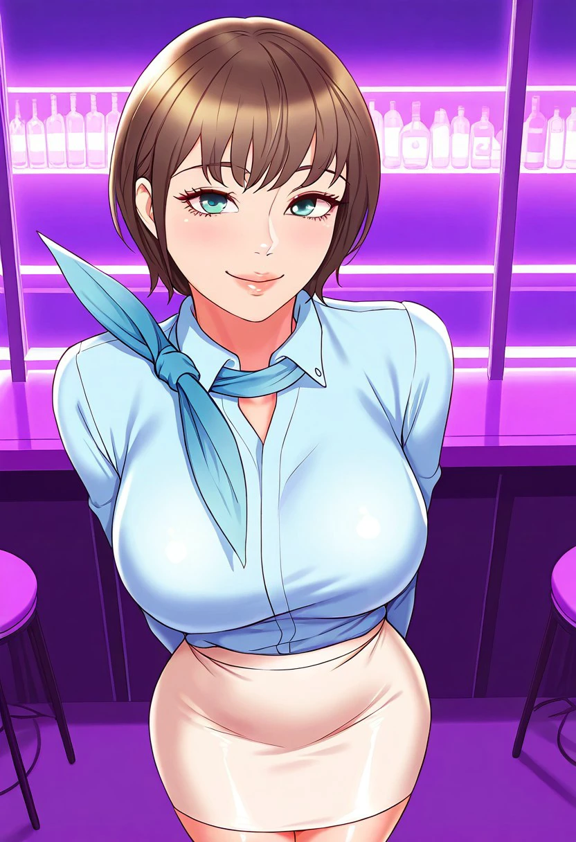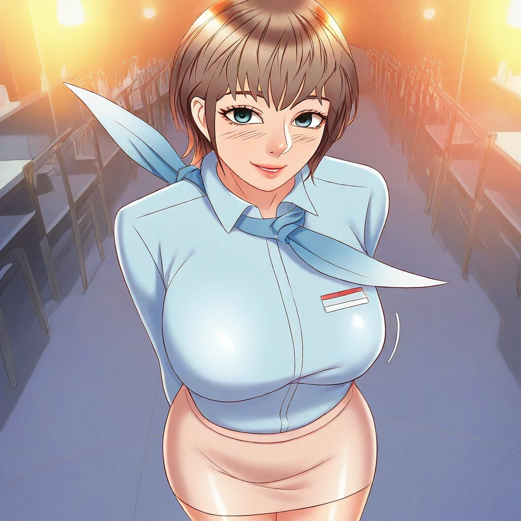 7. ((flight-attendant uniform, blue long-sleeves shirt with blue flight-attendant scarf, sexy beige pencil skirt, )) black high-heels,