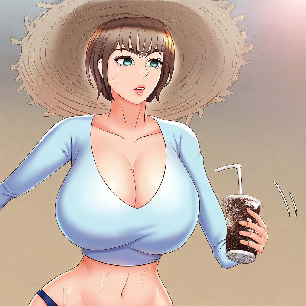 19. ((sexy ?????? cut-out long-sleeves v-neck blue top, obscene cleavage, huge cleavage, gigantic cleavage, blue bikini bottom, big straw hat with black band, ))