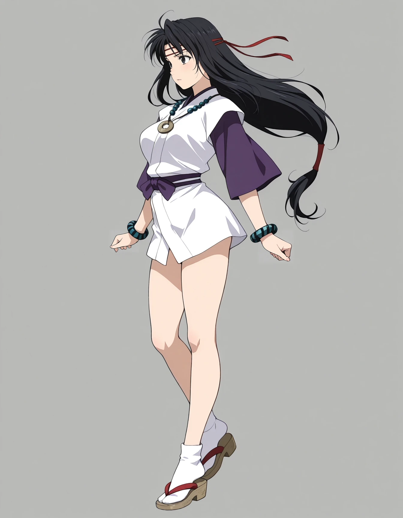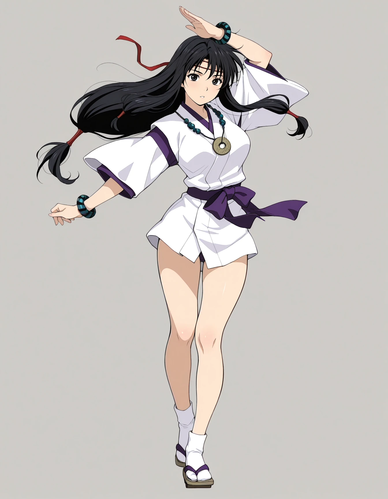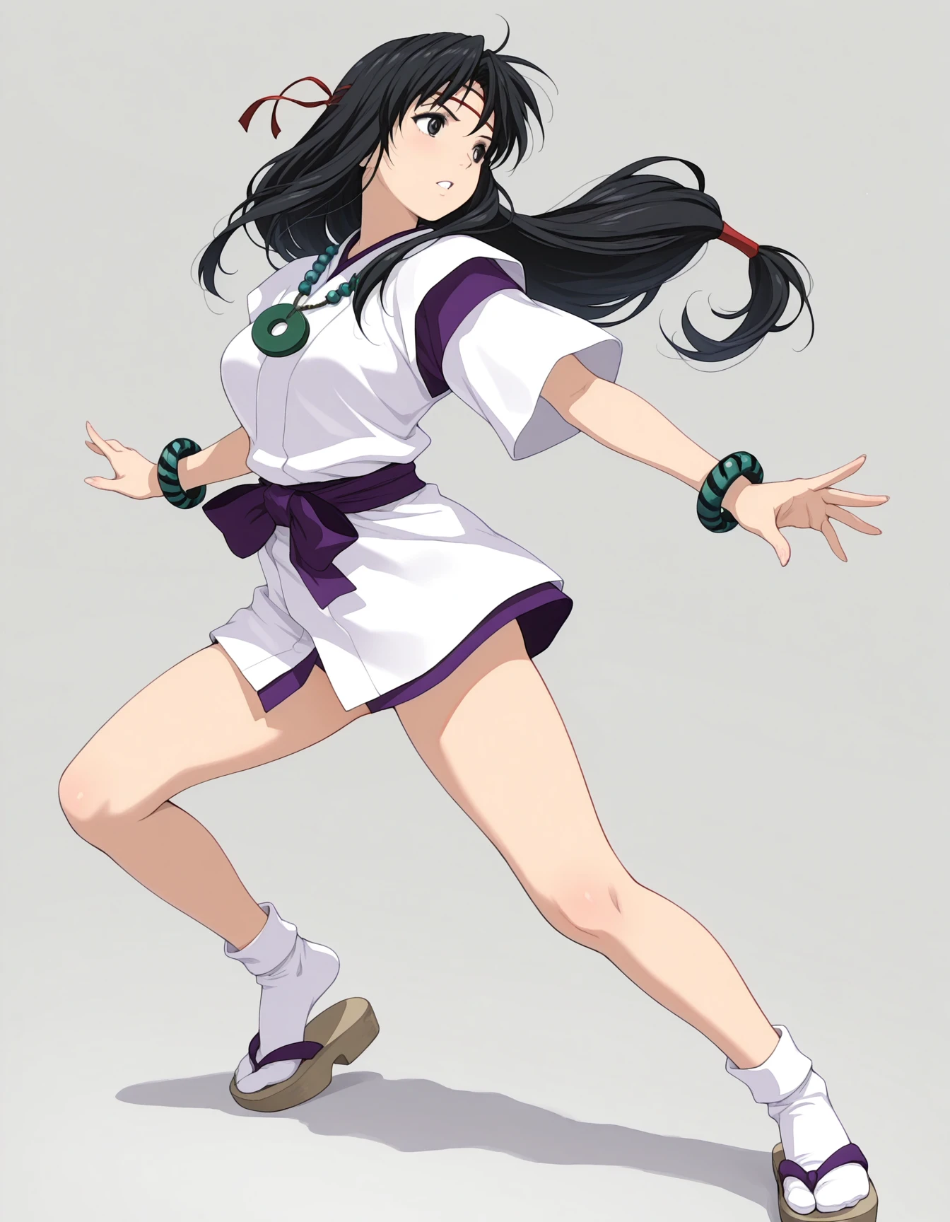 mai_kdsmiko,long_hair,black_hair,black_eyes,headband,japanese_clothes,white_clothes,necklace,bracelet,full body,dynamic pose,bare_legs,white_socks,clogs