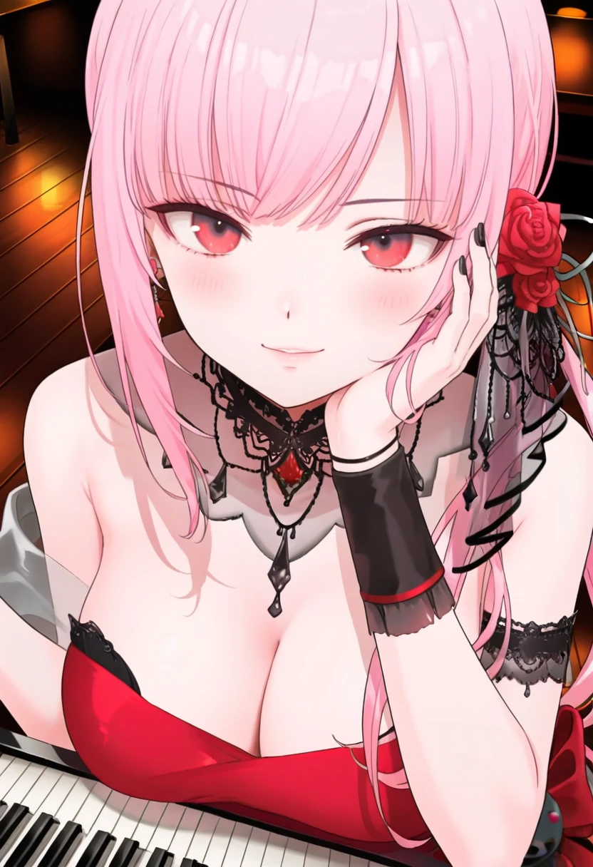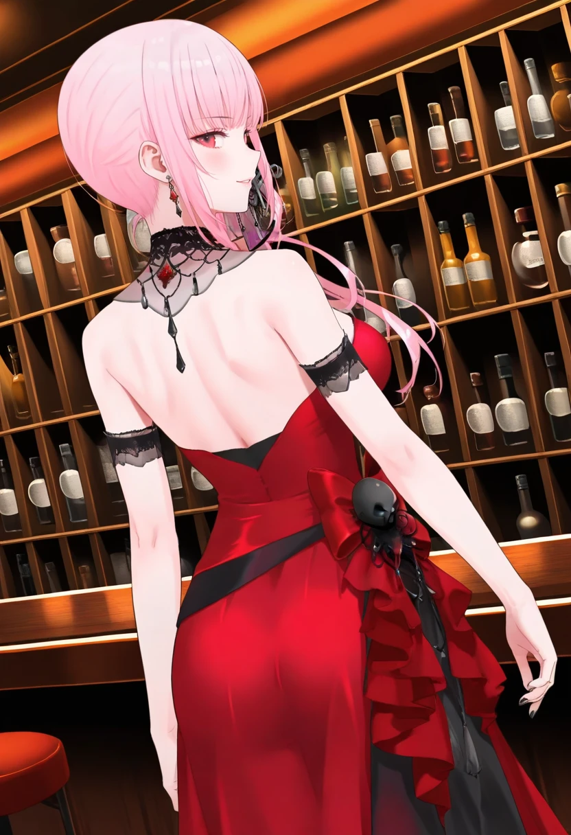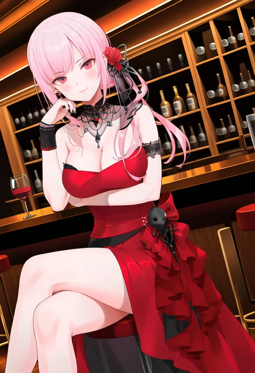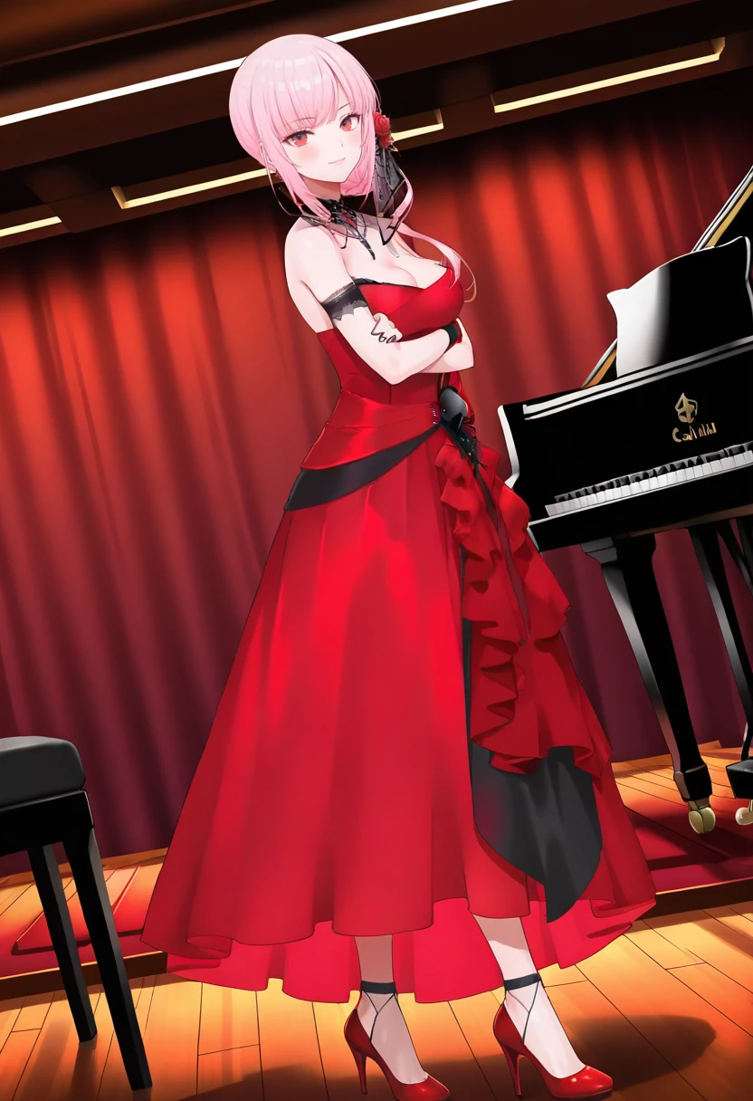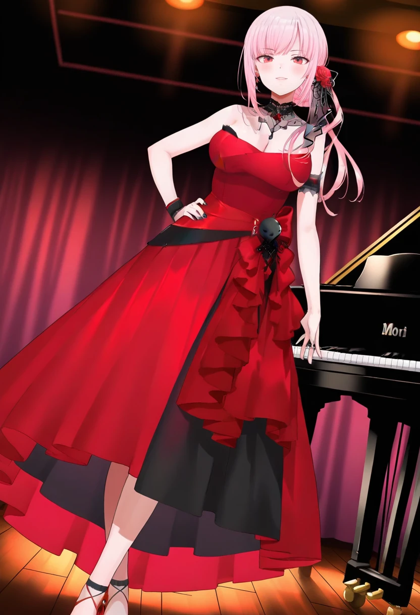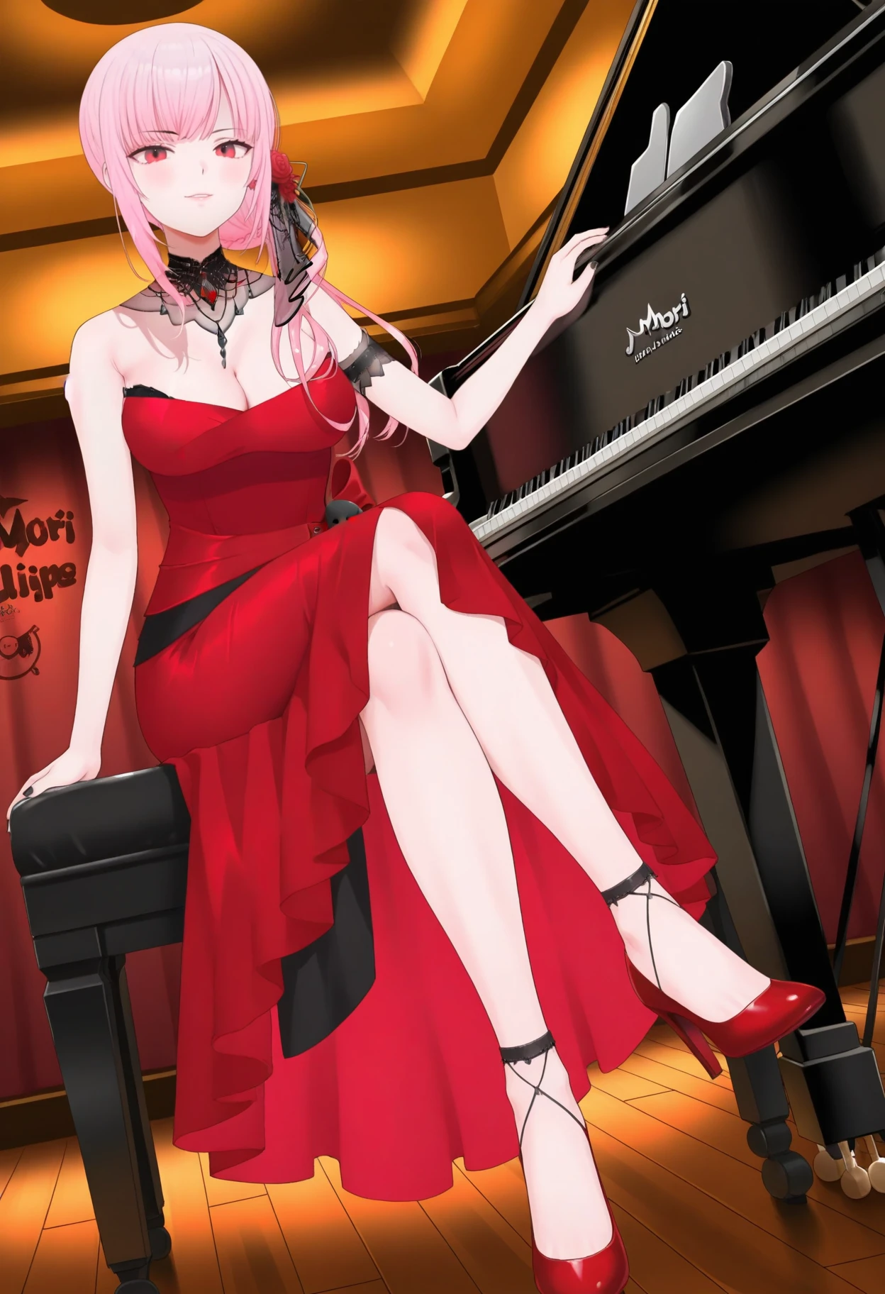 mori calliope, mori calliope (party dress), pink hair, long hair, side ponytail, red eyes, lips, large breasts, detached collar, red dress, long dress, arm strap, black nails, red high heels,Artistic Disclaimer: