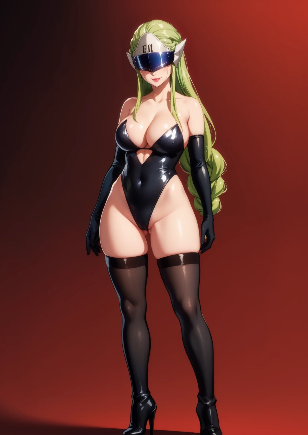 ezwitchhelm,maturefemale, green hair,long hair,covered eyes,braided ponytail,lips