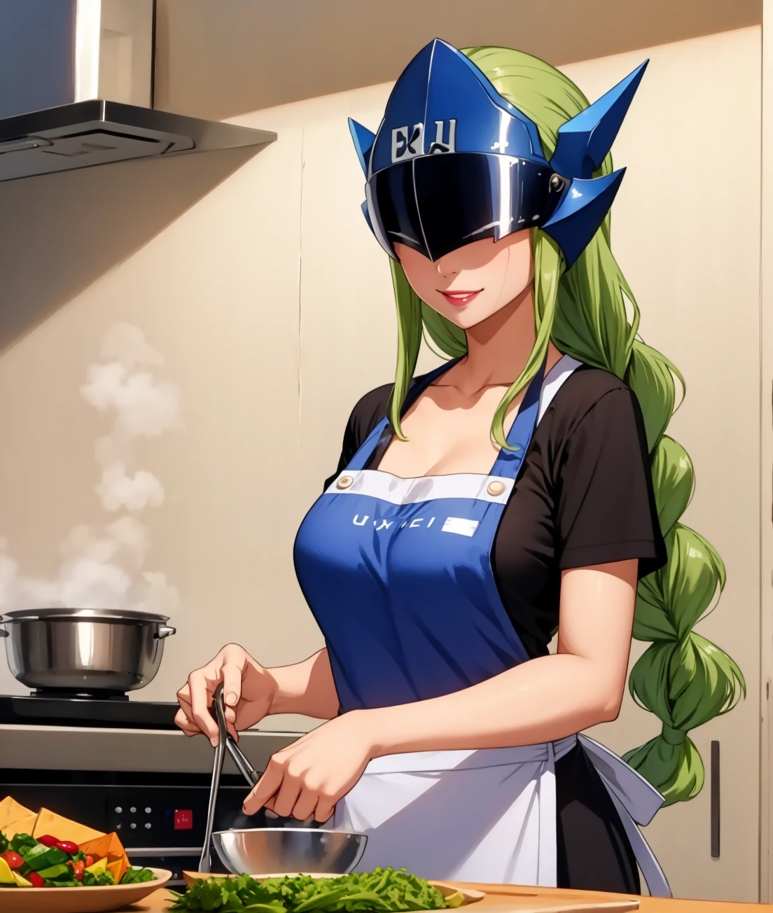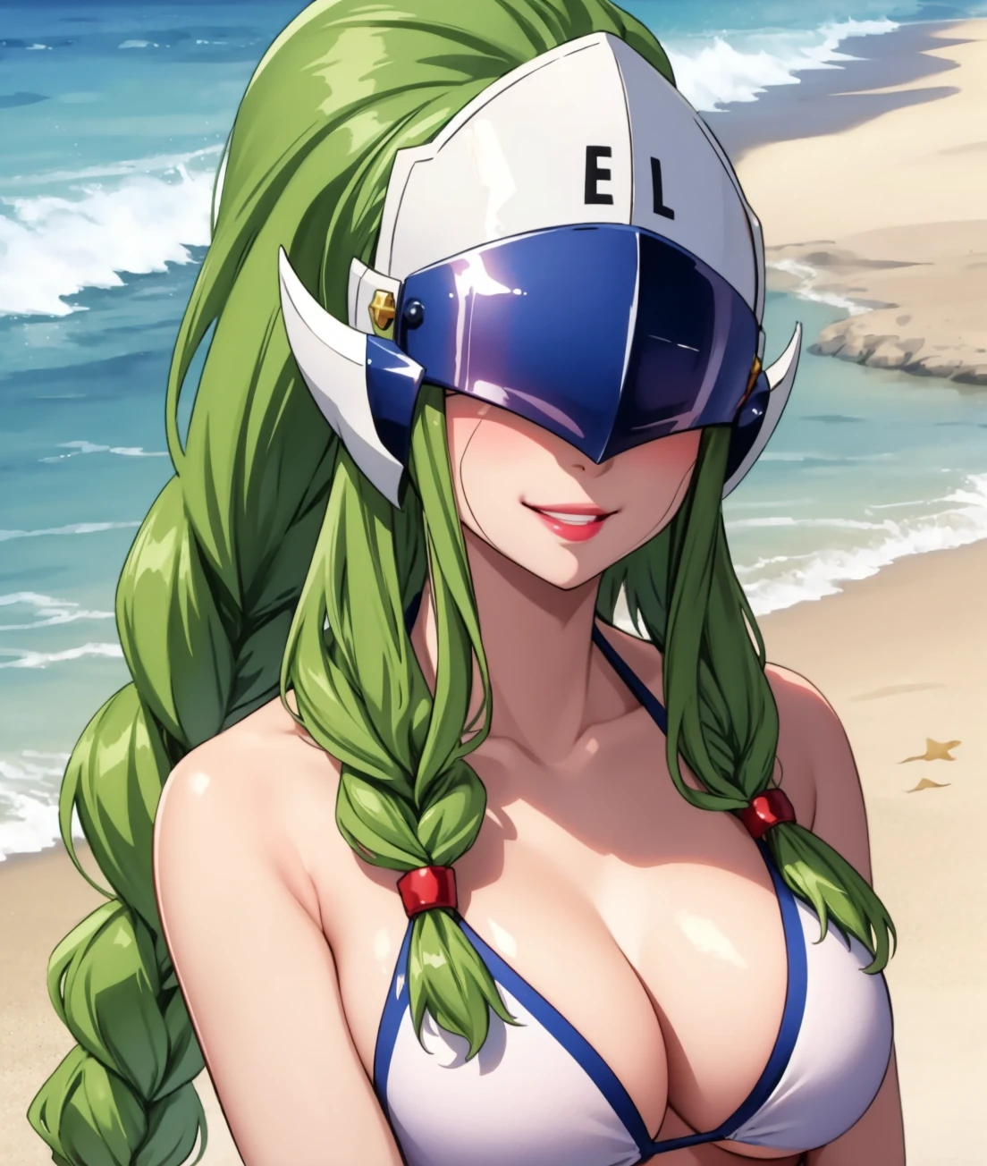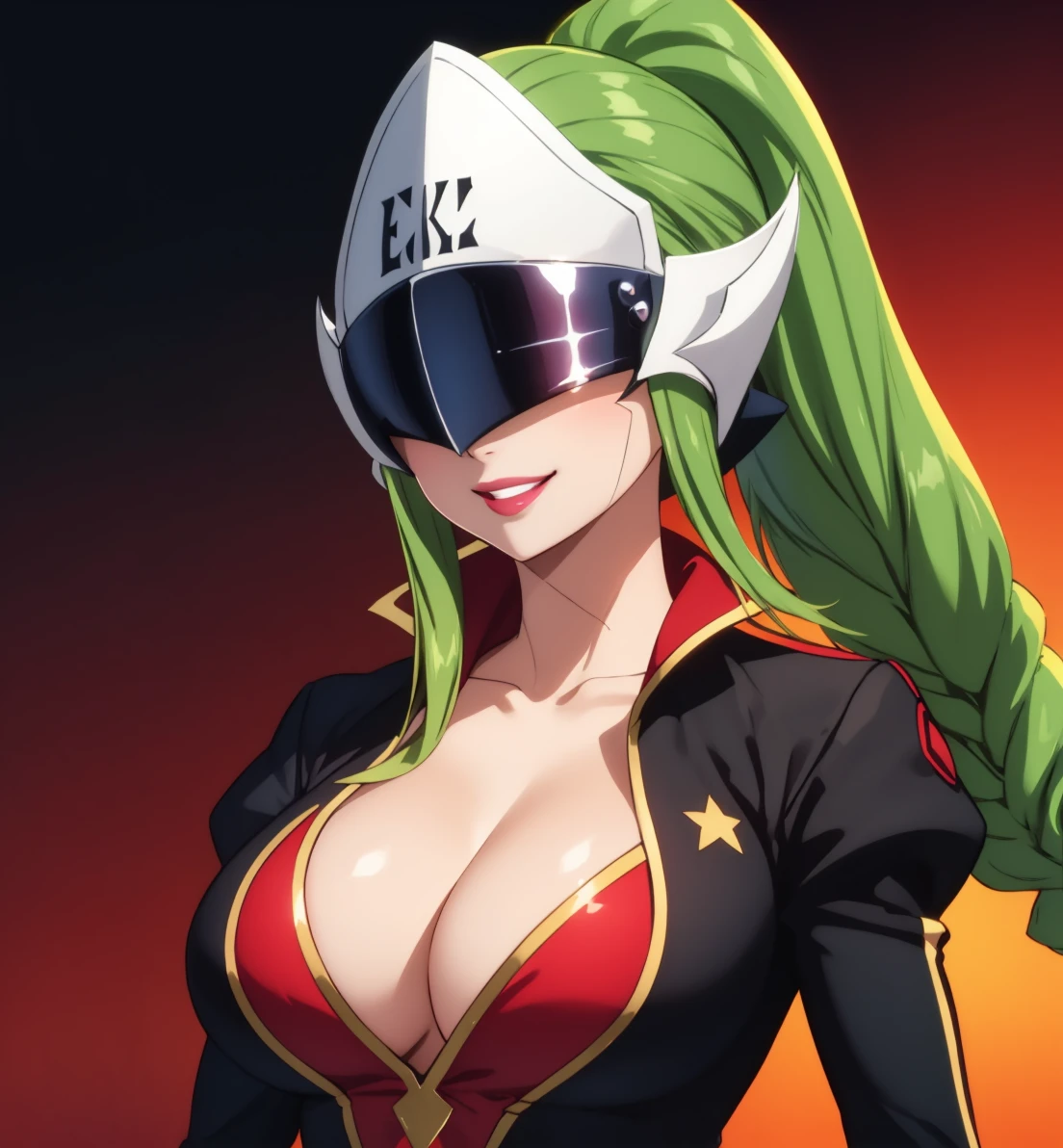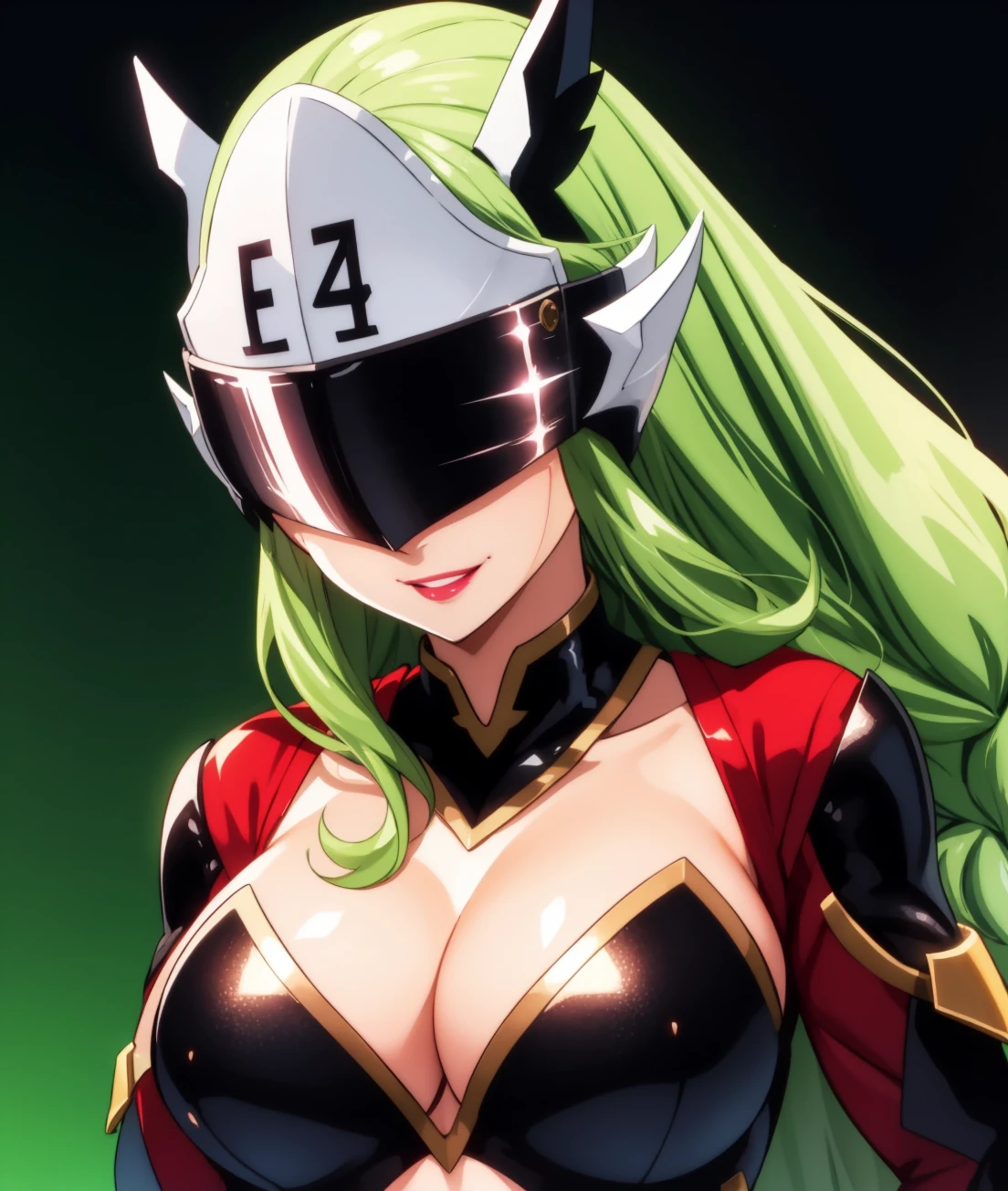 • "witchbattledress" generally generates the helmet + visor look. Add "combat visor, combat helmet, concealed eyes" to help with achieving said look.